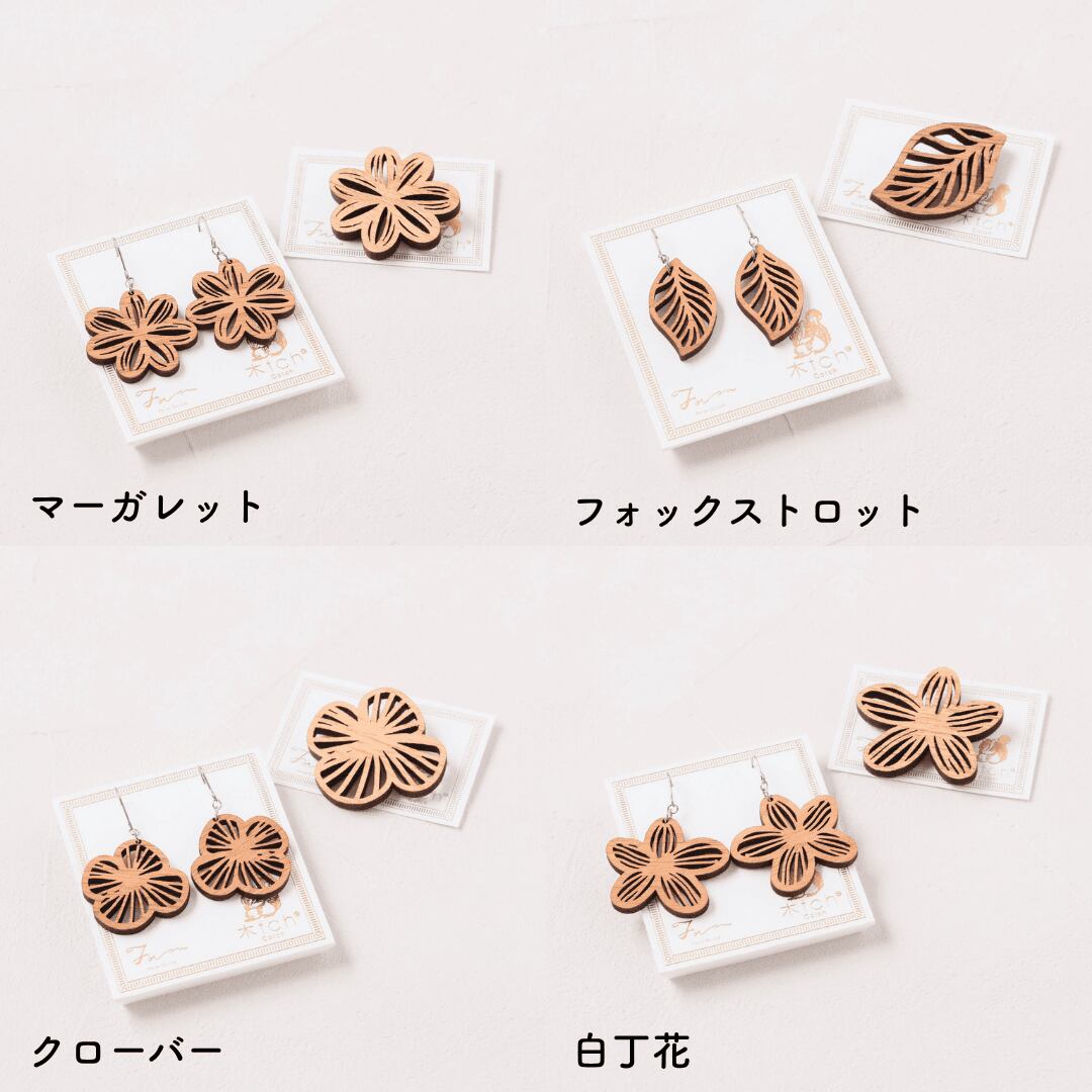 材質(ピアス・ブローチ):クルミ材、柿渋、蜜蝋