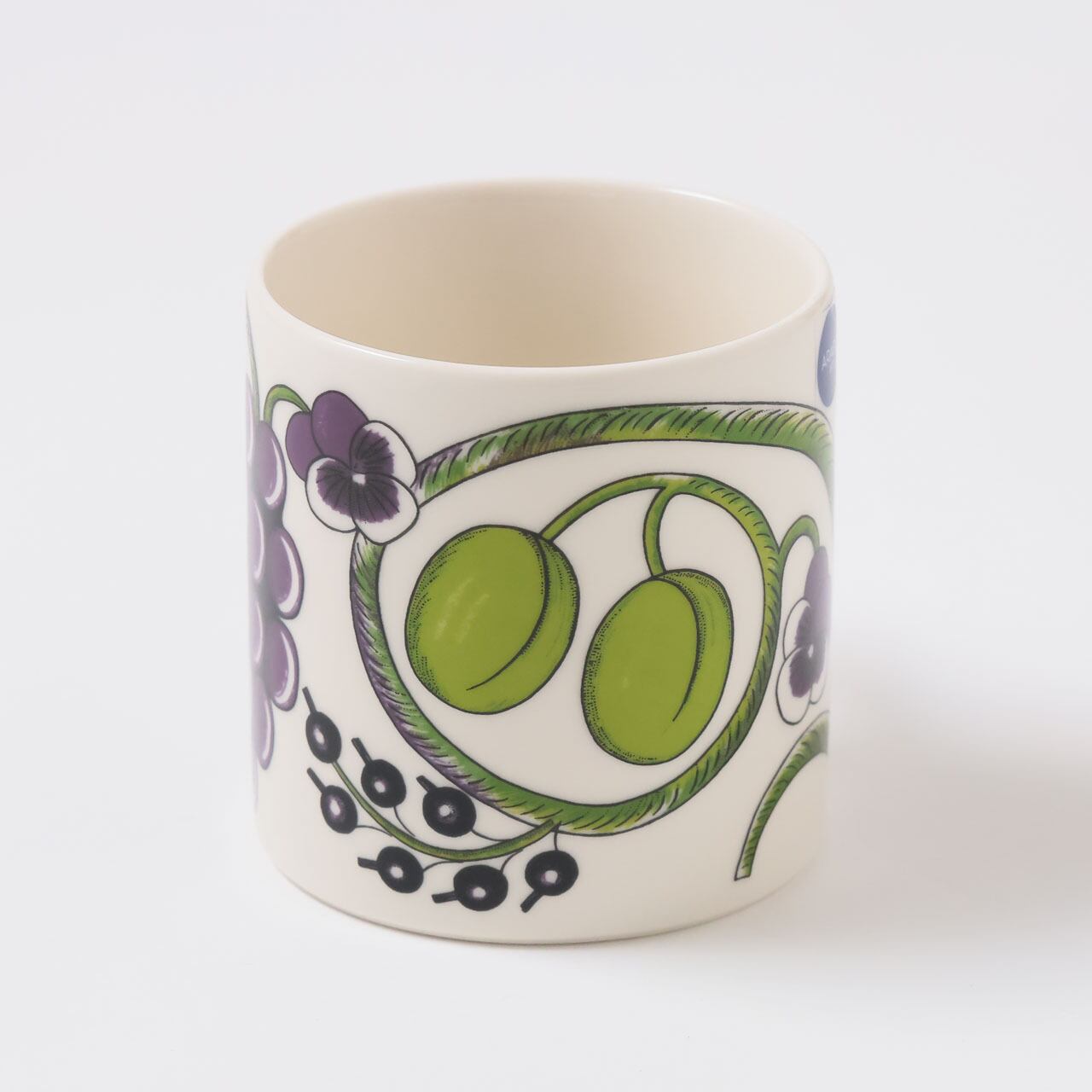 シンプルなフォルムに、パンジーやカシス、ぶどう、りんごなどの瑞々しい花やフルーツのモチーフが華やかに描かれたARABIA(アラビア)パラティッシ。