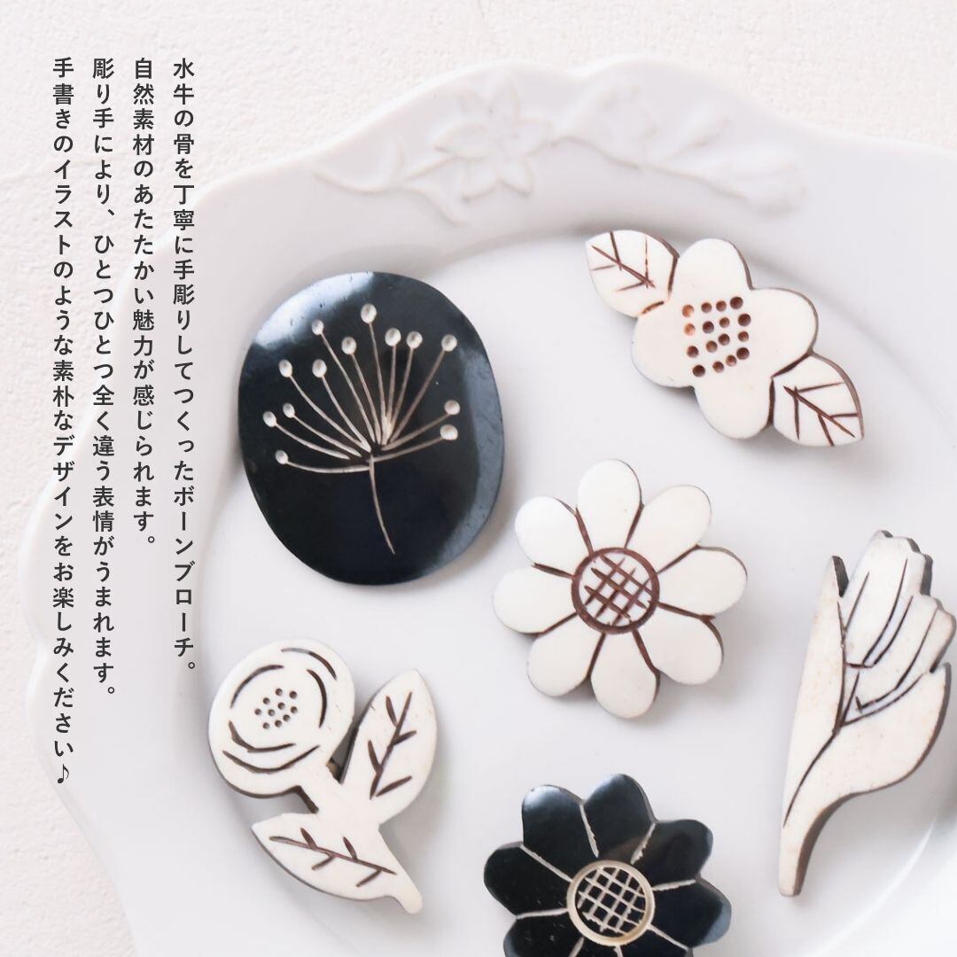 ブローチ おしゃれ カジュアル 普段使い 自然素材 ボーンブローチ 水牛 ハンドメイド 手作り かわいい bone brooch 骨 花 フラワー ナチュラル ホワイト ブラック モノトーン アクセサリー ギフト プレゼント Ac025