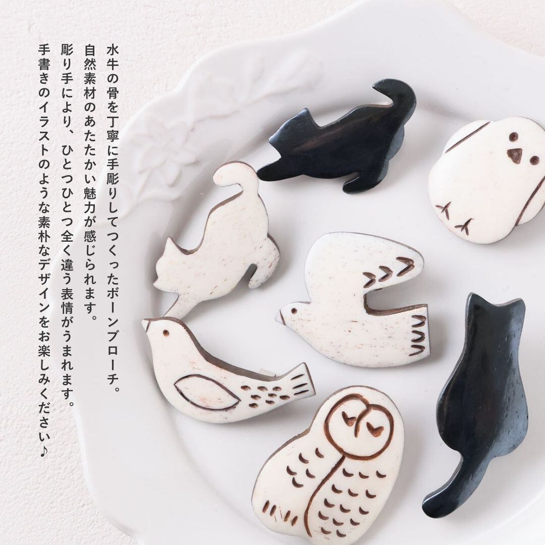 ブローチ おしゃれ カジュアル 普段使い 自然素材 ボーンブローチ 水牛 ハンドメイド 手作り かわいい bone brooch 骨 ネコ 猫 生き物 動物 鳥 ナチュラル ホワイト ブラック モノトーン アクセサリー ギフト プレゼント Ac026