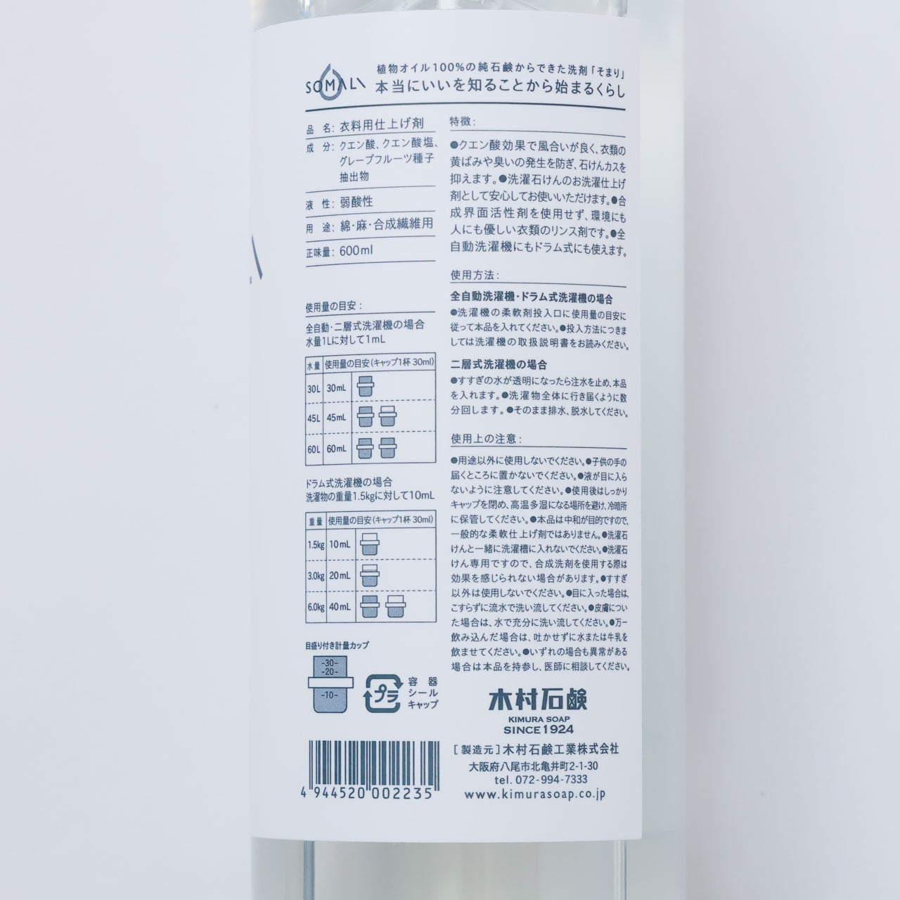 木村石鹸 SOMALI ソマリ そまり 衣類のリンス剤 600ml 本体 ボトル 日本製 衣類用液体洗剤 ギフト 石鹸 石けん 天然素材 弱酸性 衣類用洗剤 洗剤 天然 肌に優しい 洗濯 おしゃれ プレゼント So005