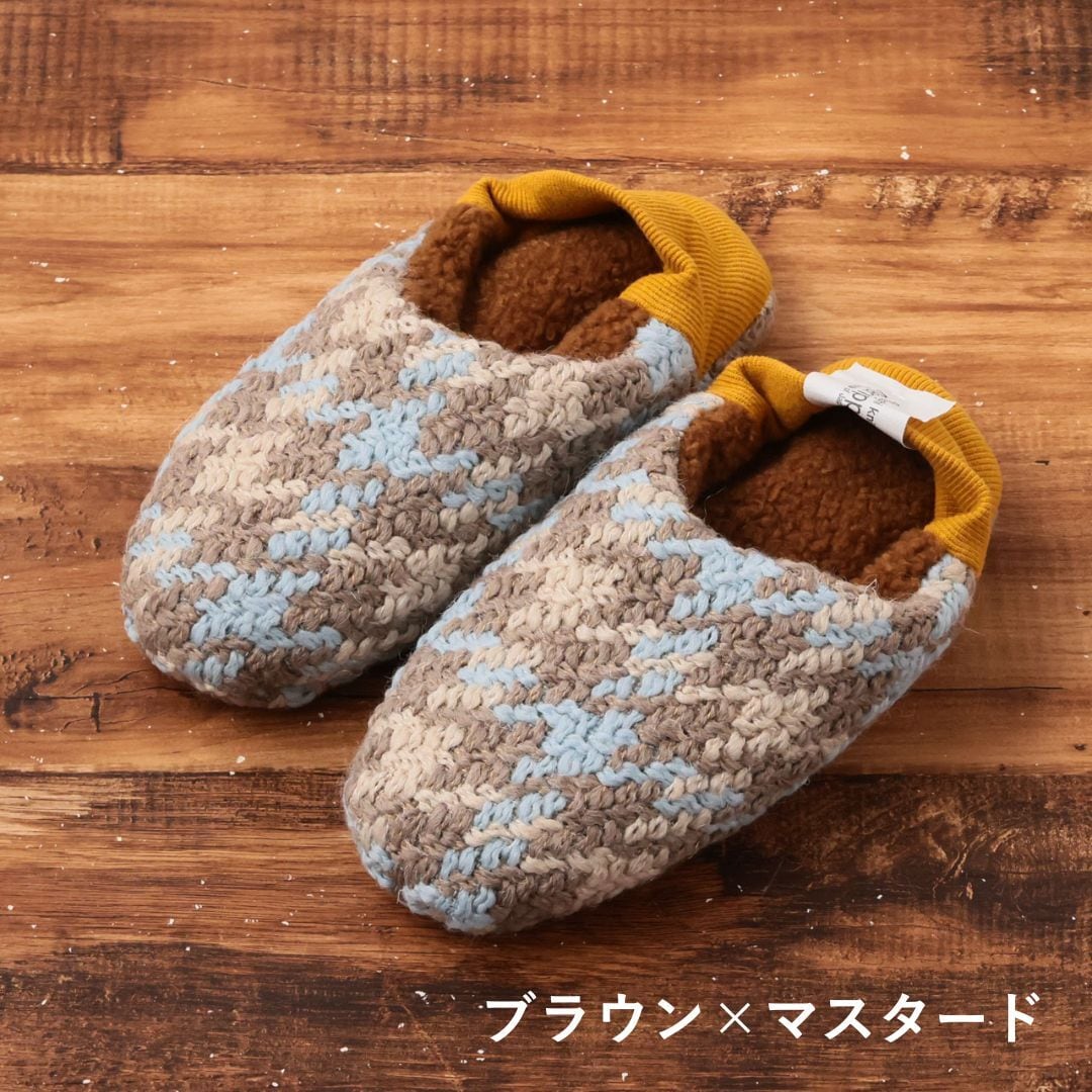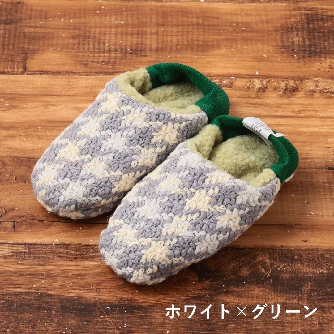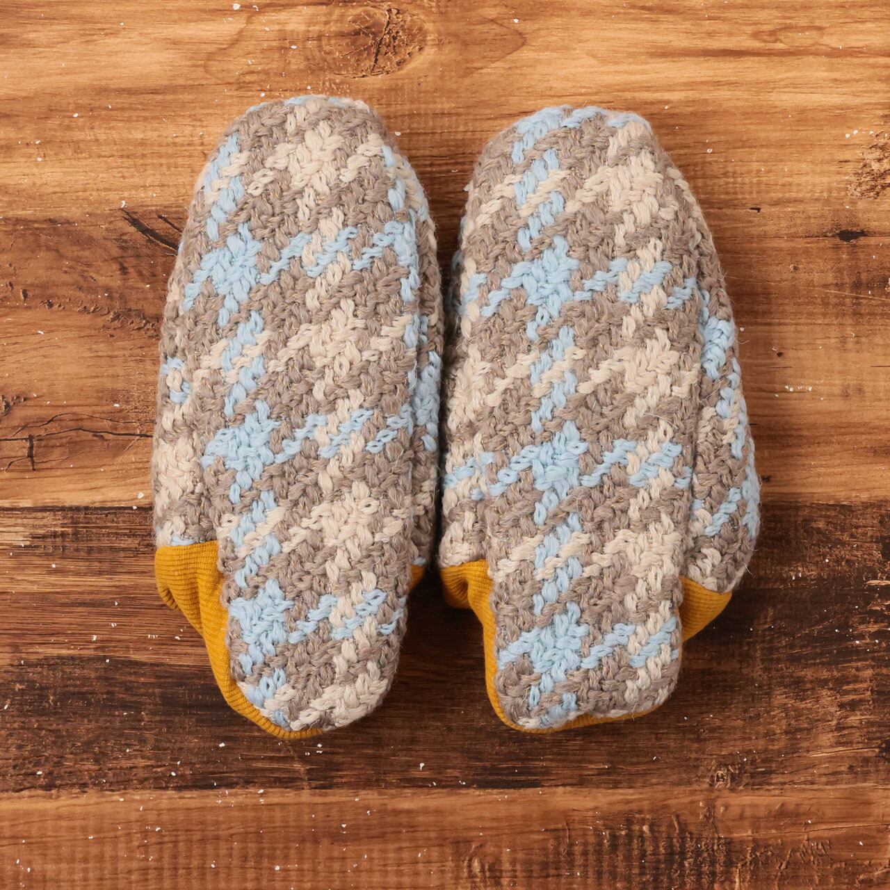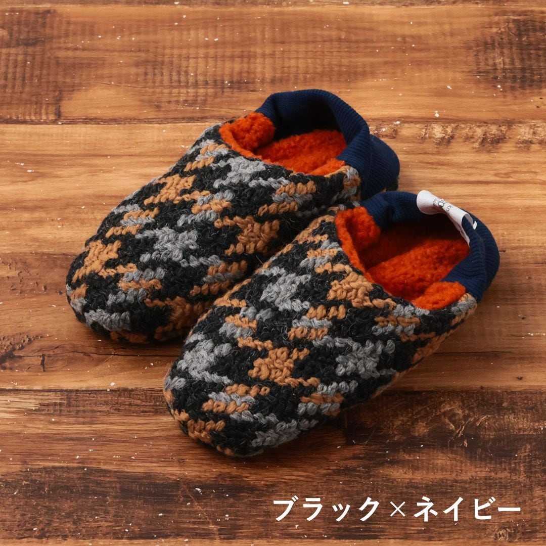 太めの糸でざっくりと編み上げた、ロービング調の温かみある千鳥柄スリッパ。