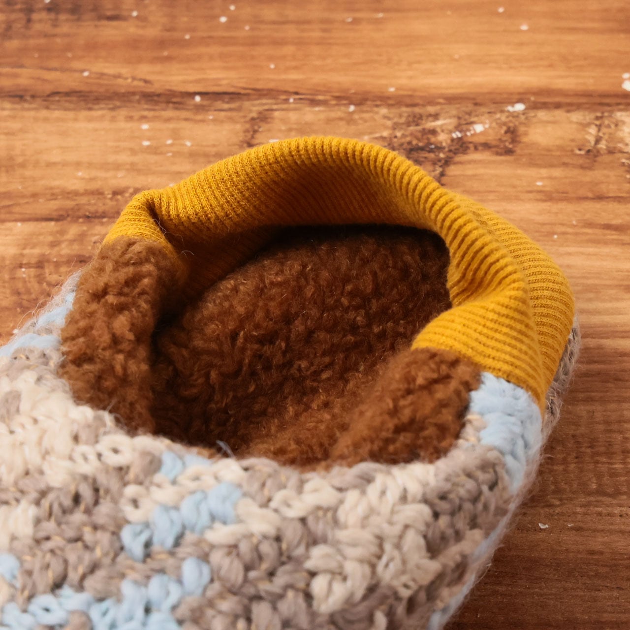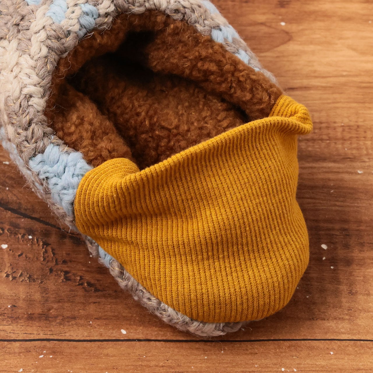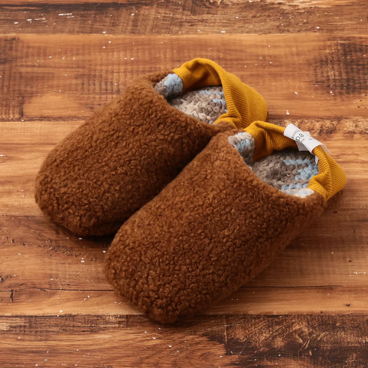 太めの糸でざっくりと編み上げた、ロービング調の温かみある千鳥柄スリッパ。
