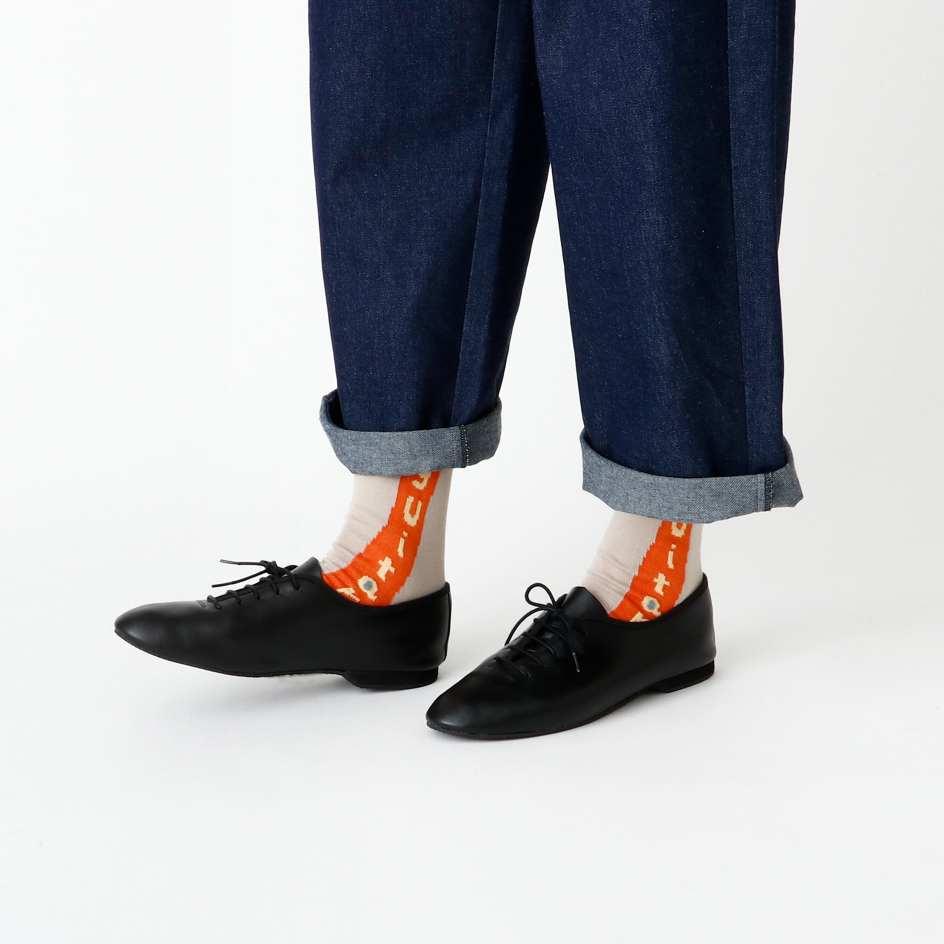 履くと左右で柄が変わるアシンメトリーなデザインが、足元を見るたびに気分を高めてくれます。