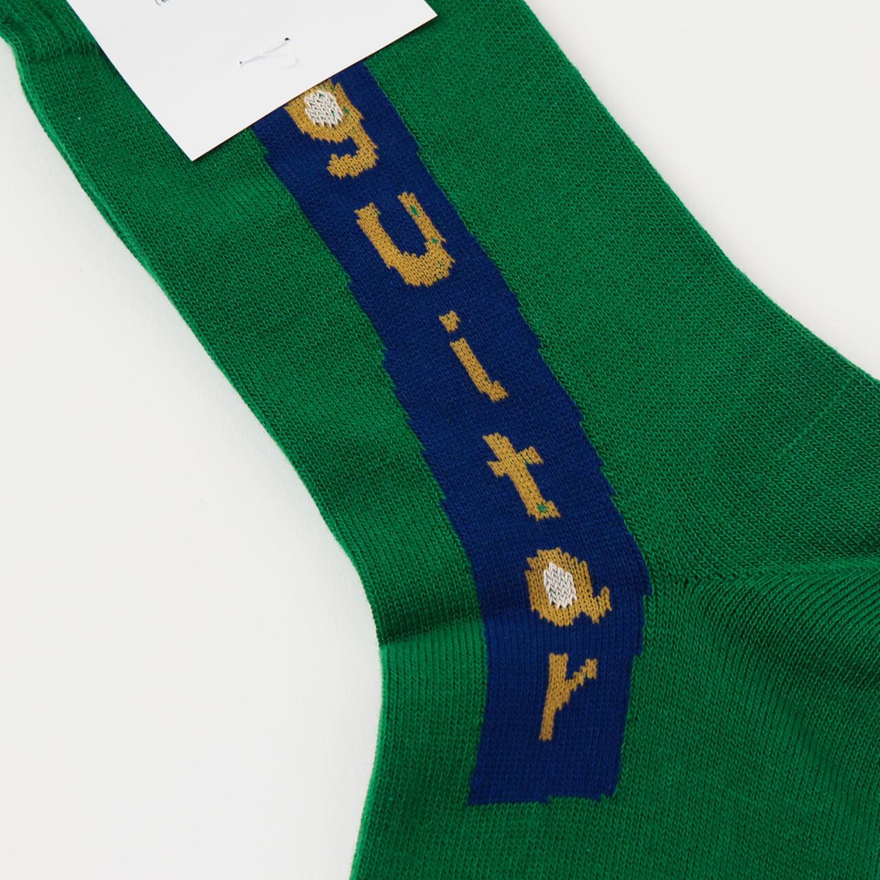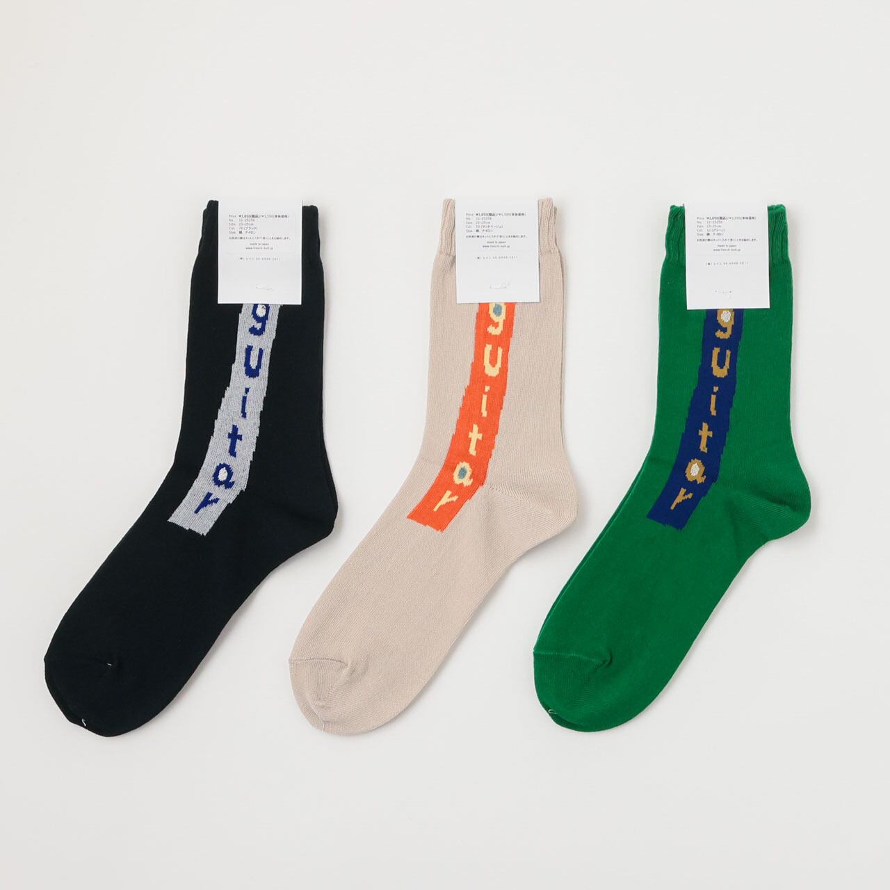 このギターソックスは、アコースティックギターの柄と、反対側のguitarロゴが魅力的な、遊び心あふれる一足です。