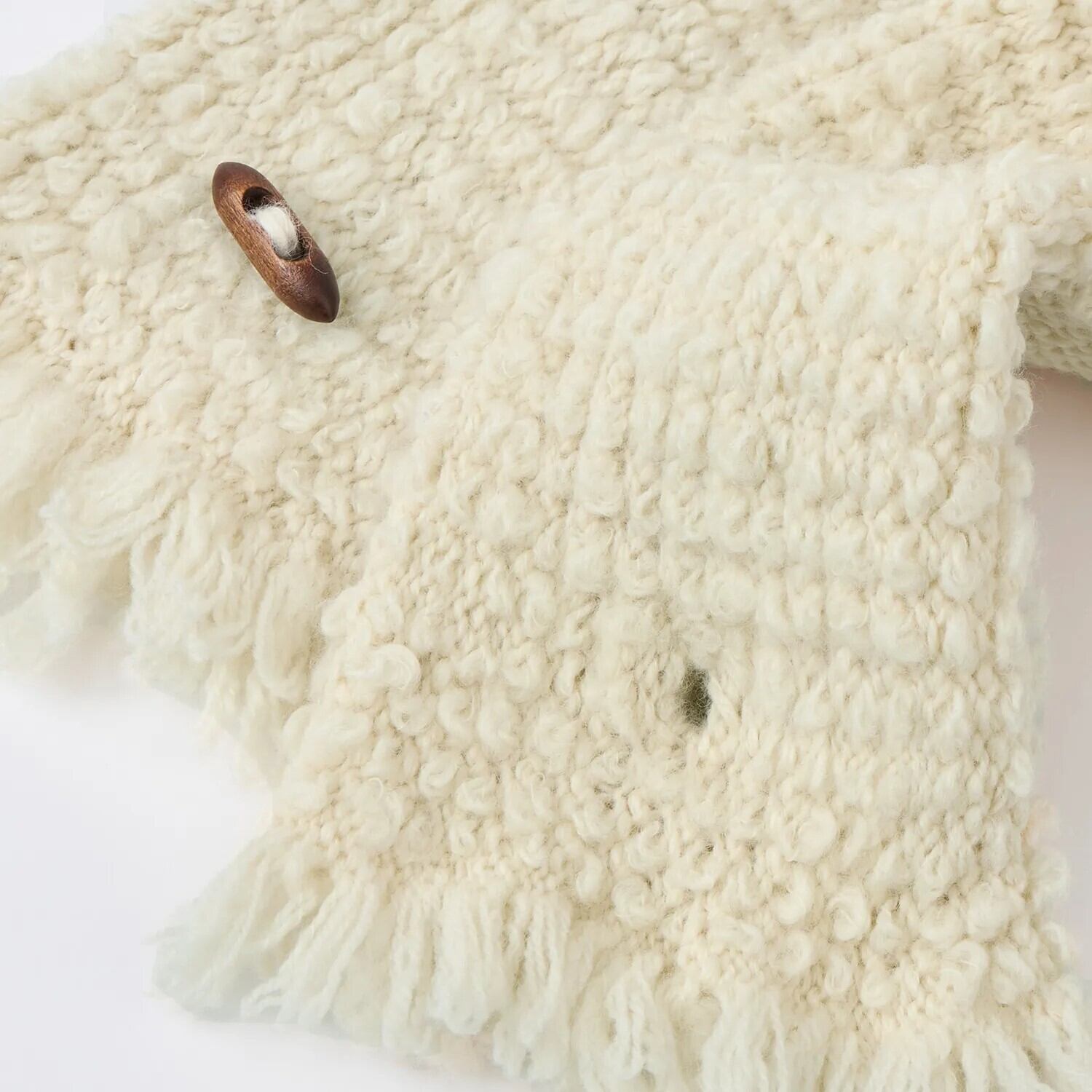 裾にはふんわり可愛いフリンジと、シックな天然ウッドボタンをあしらい、アクセントに。