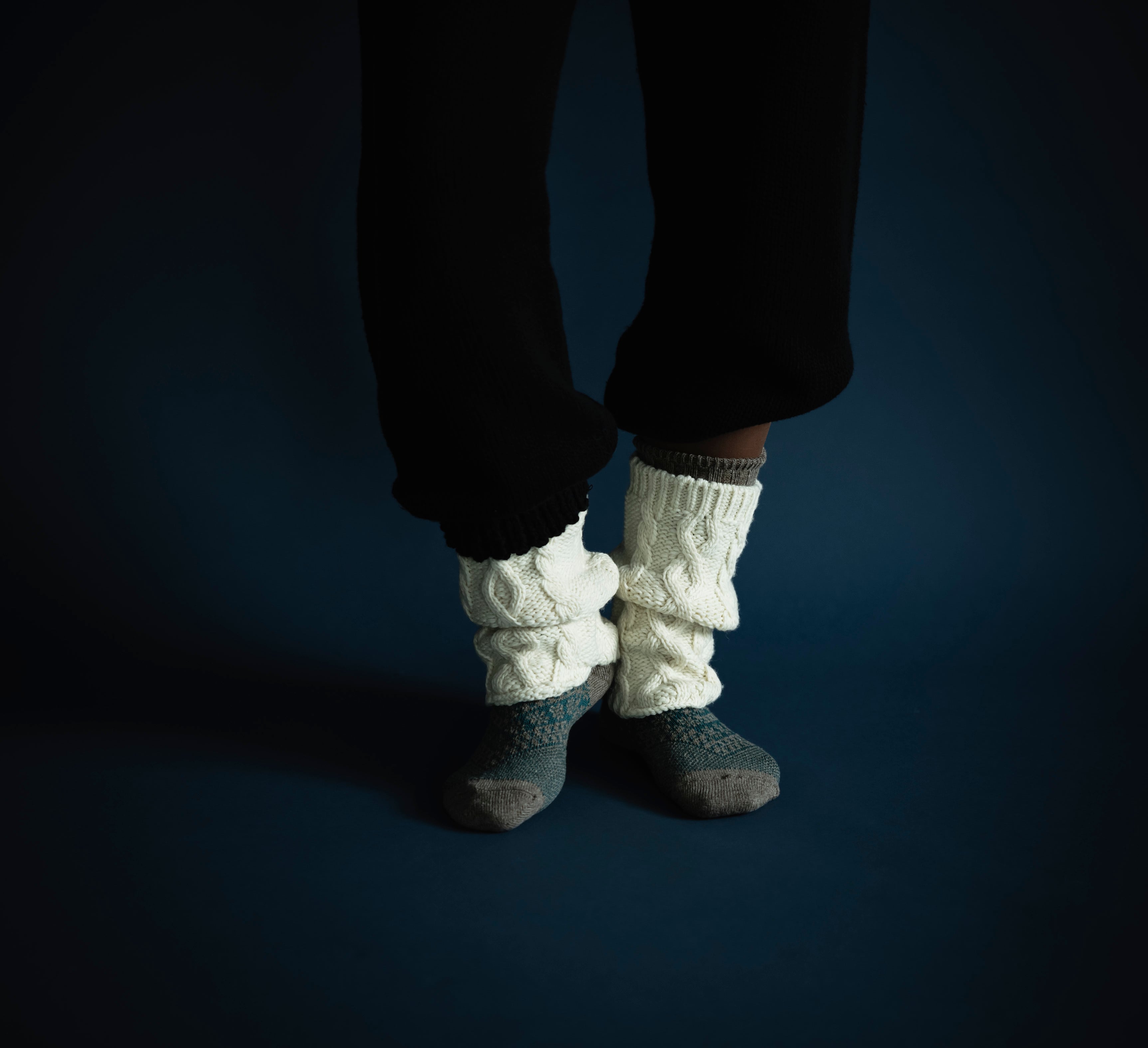 肌あたりが優しいフレンチメリノウールを使用し、職人の手仕事を感じさせるような、ざっくりとした編み立てのレッグウォーマーが届きました。