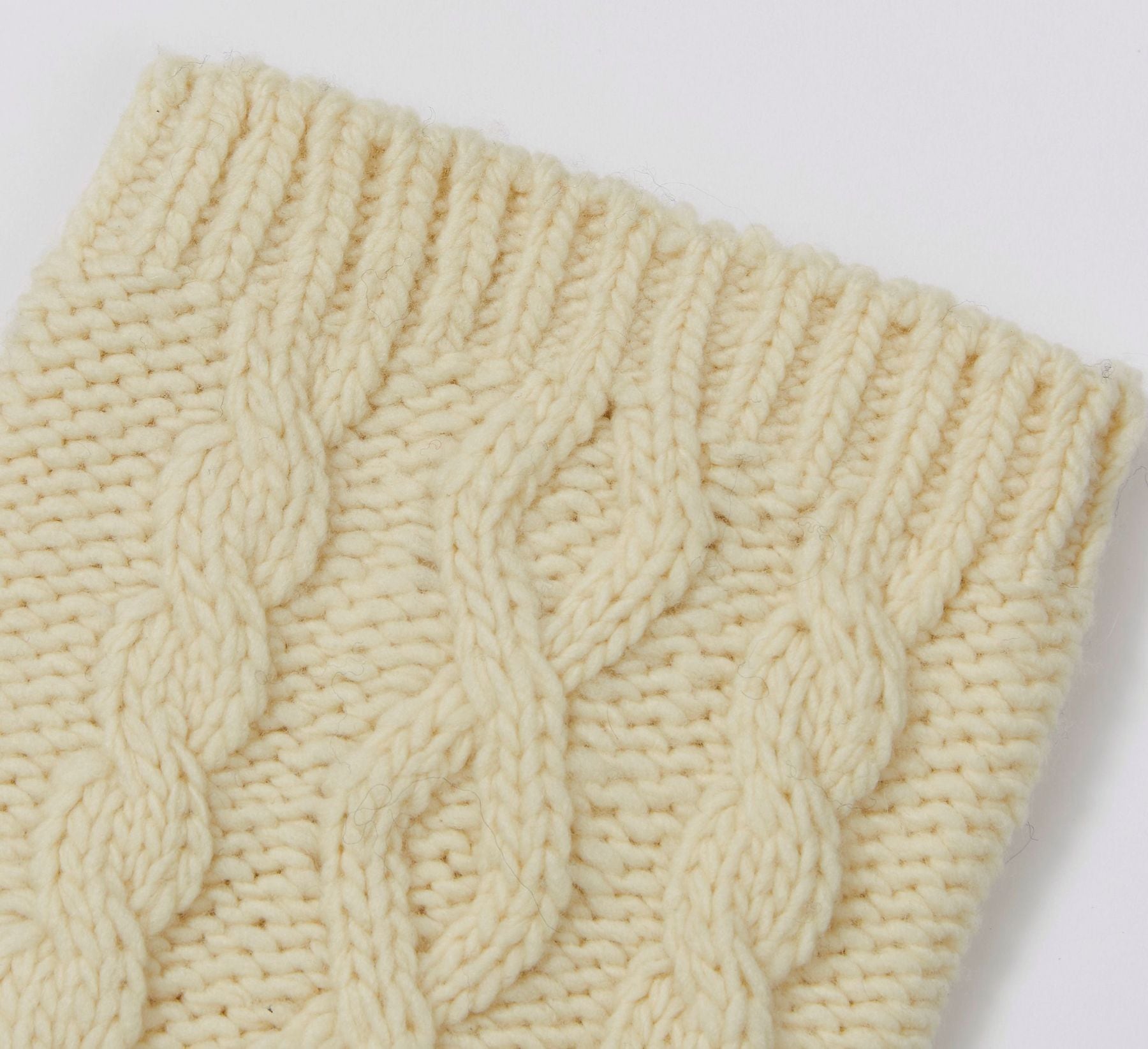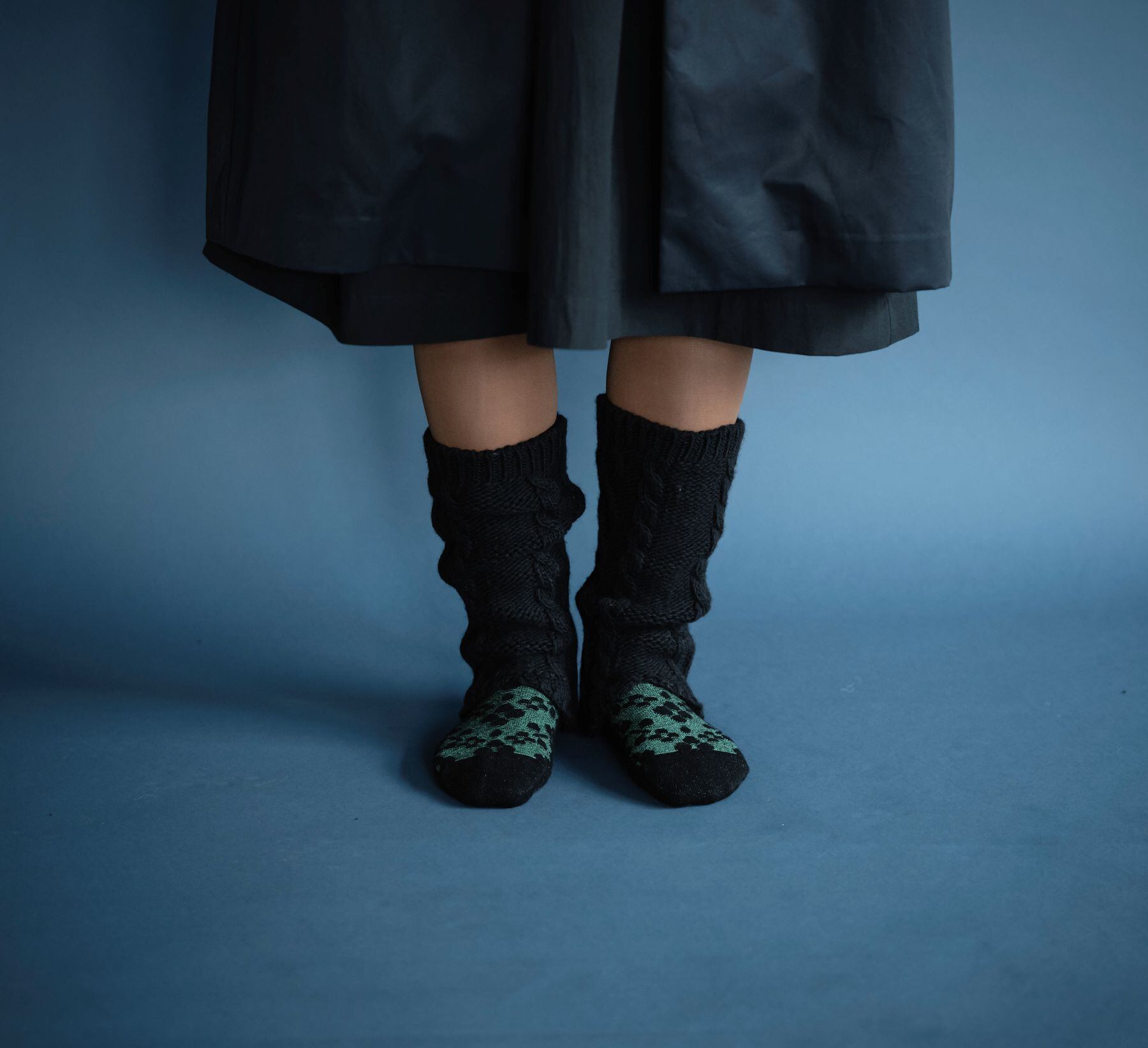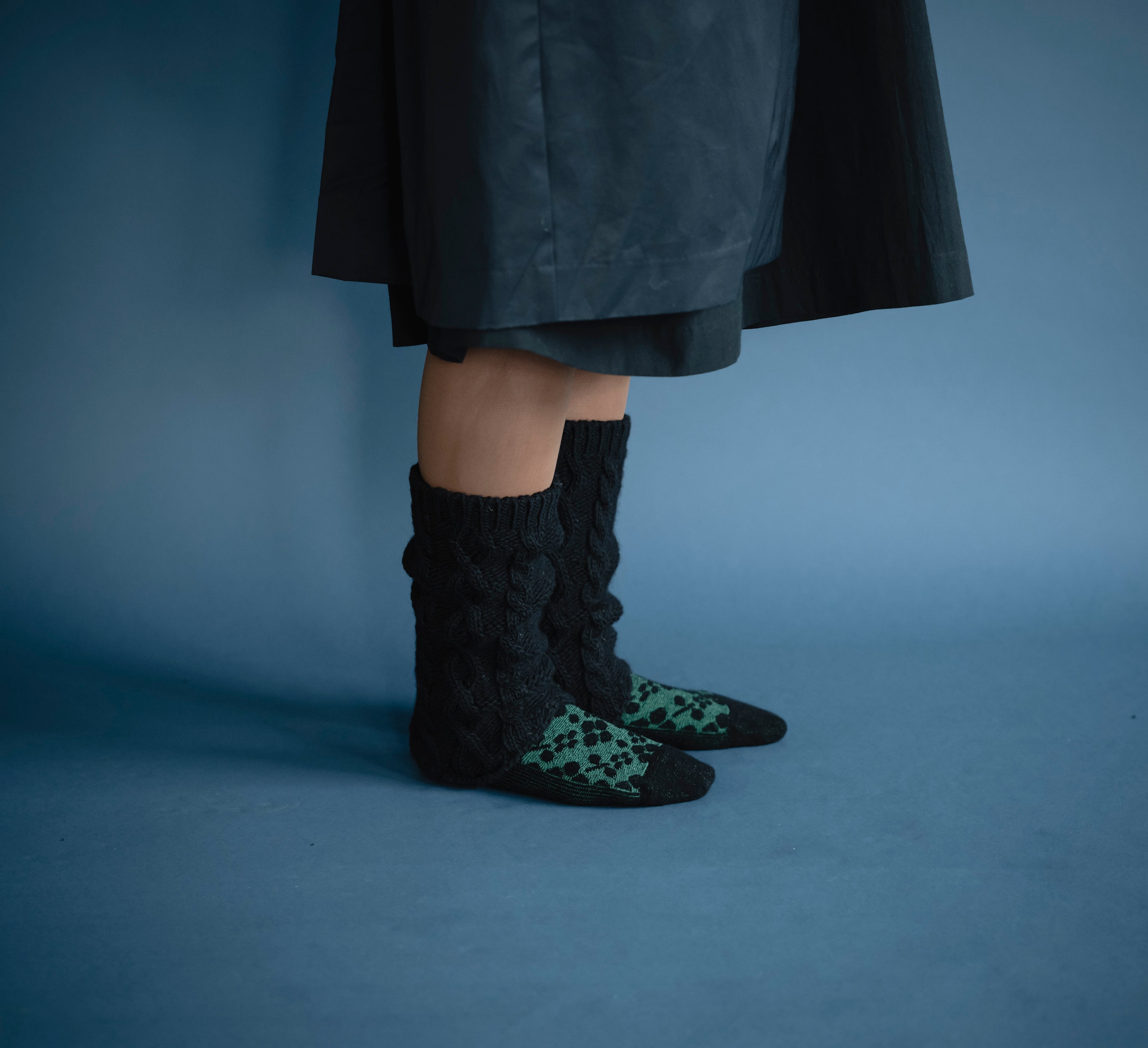 前後に施された豊かな表情のケーブル編みと、サイドを割ってアールに仕上げた個性的な足先のデザイン。