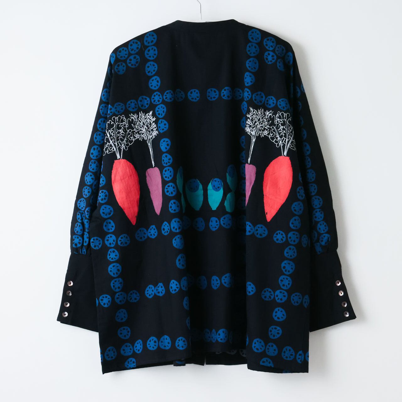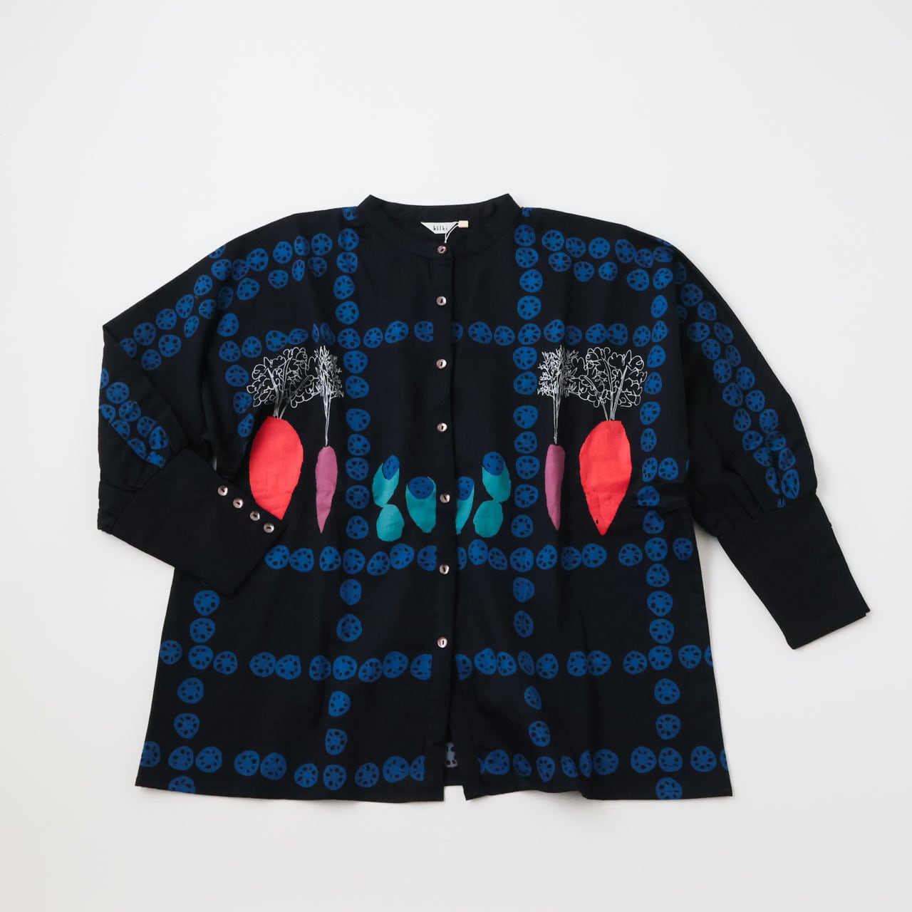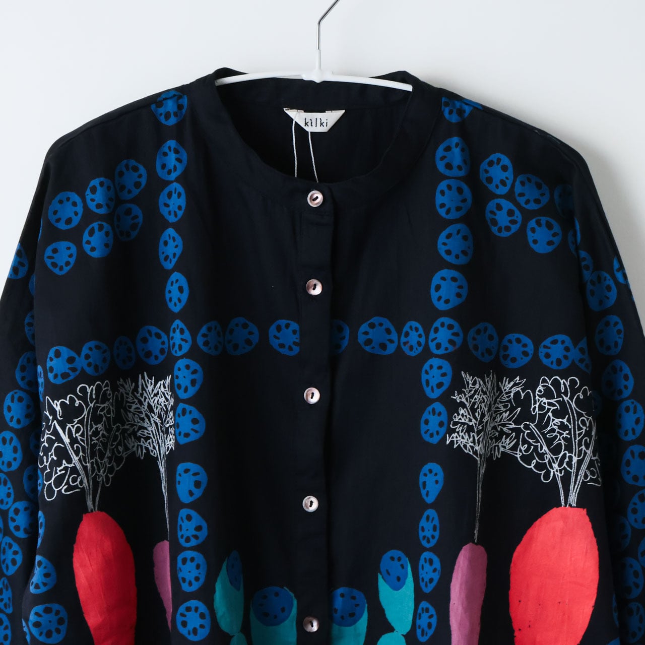 KILKI キルキー ブラウス ベジスタンプ 黒 レディース おしゃれ 長袖 襟なし シャツ ノーカラーシャツ 女性 綿 コットン 100% サテン 素材 柄物 インド製 かわいい 大人 ハンドメイド ギフト プレゼント ブラック 5S-B43 Kl002