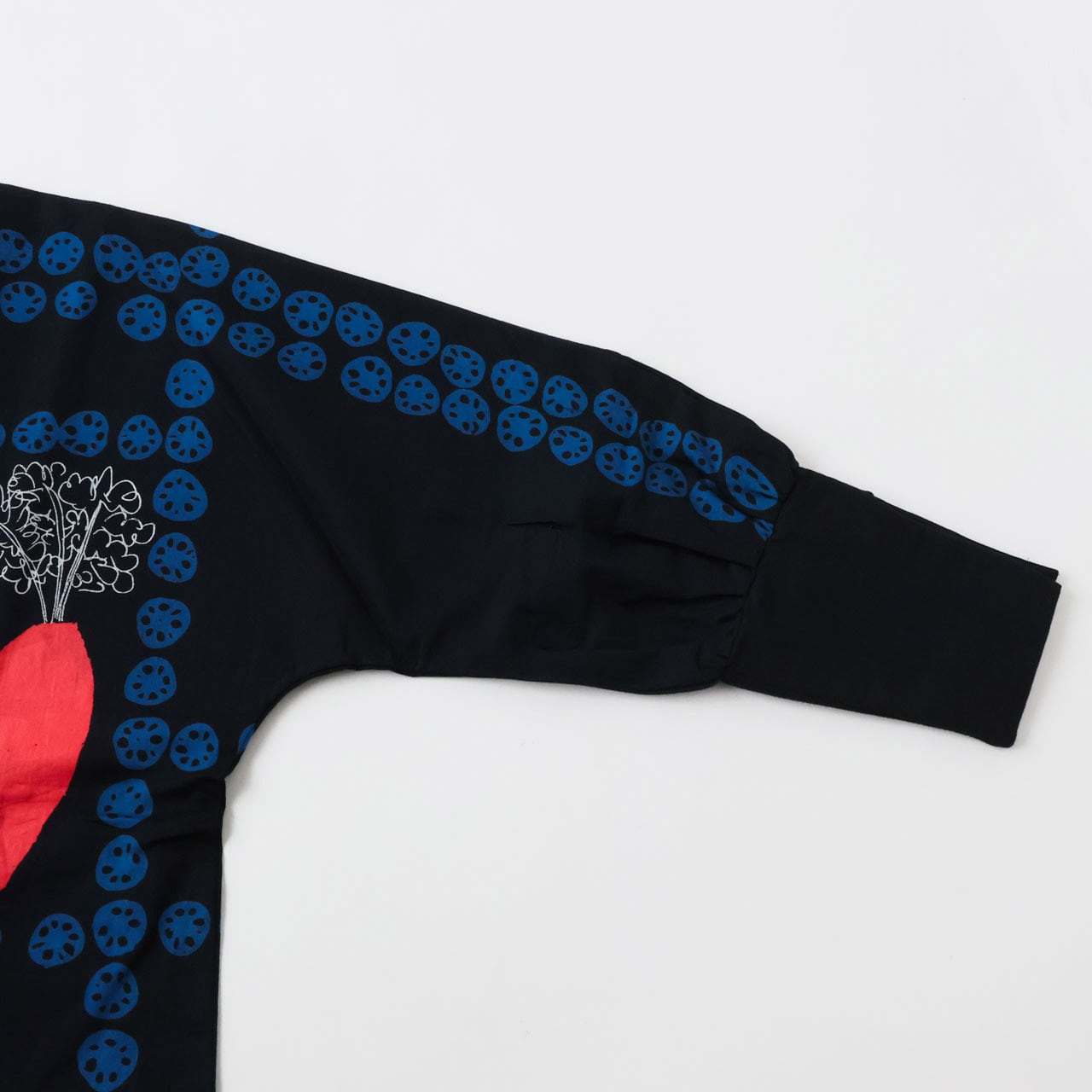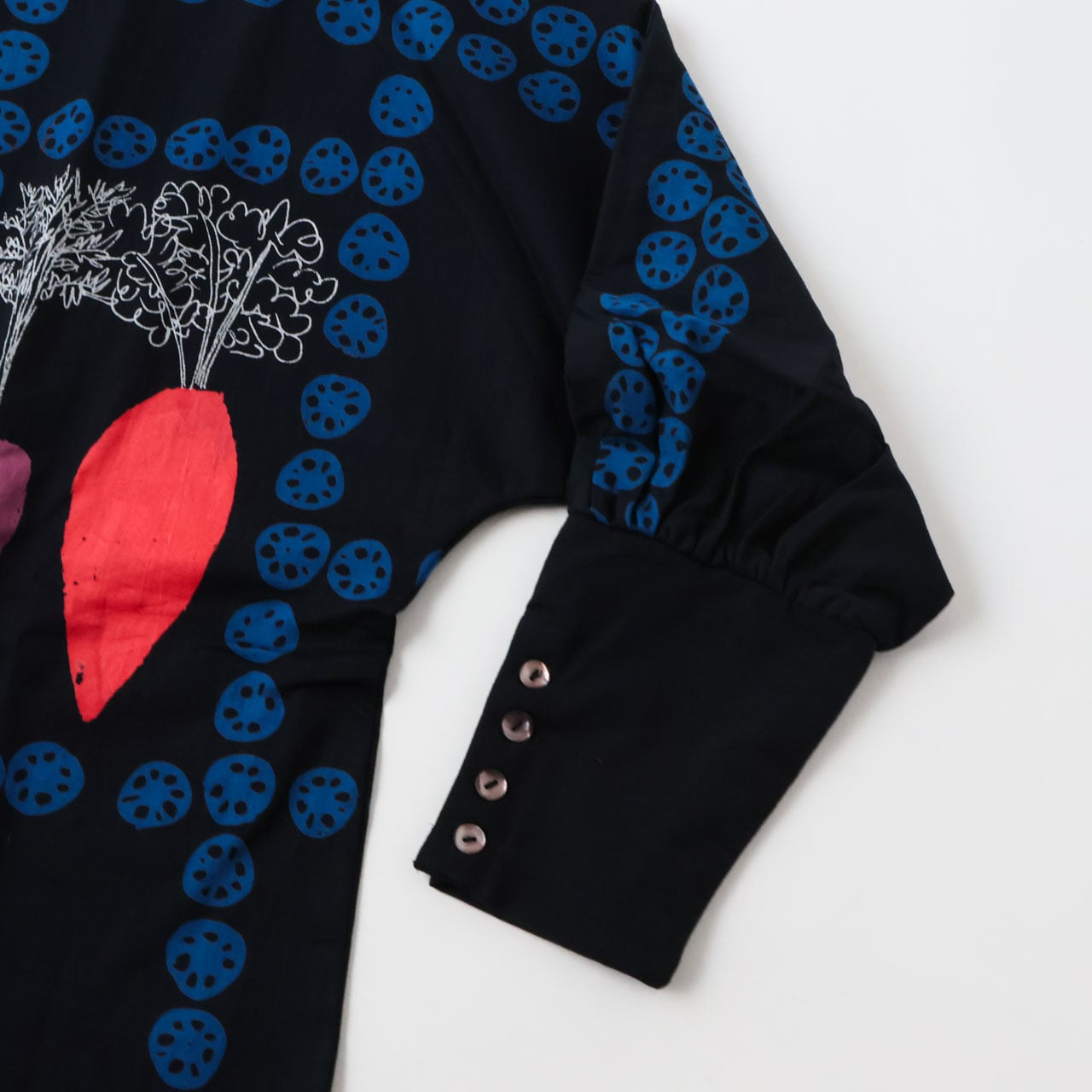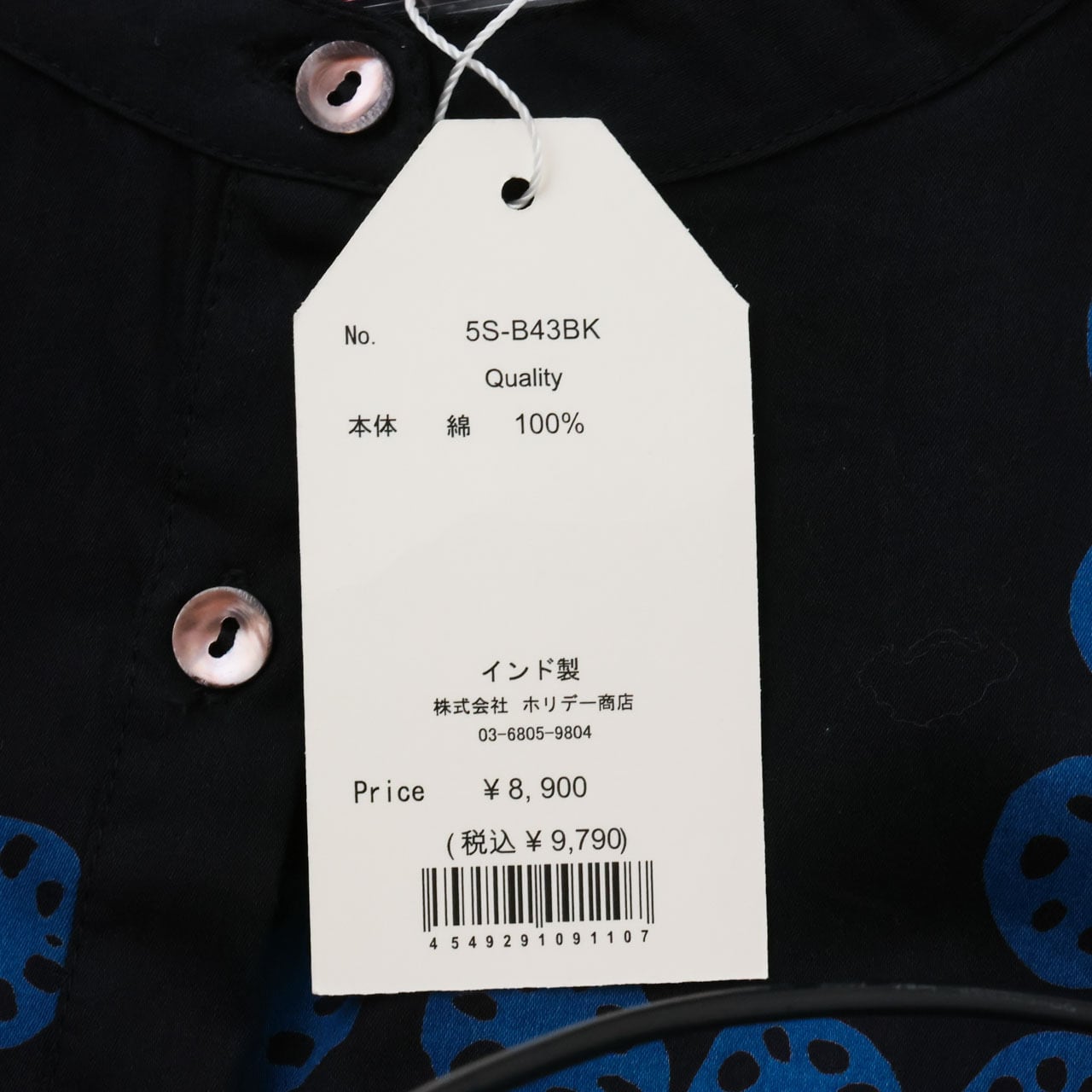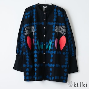 KILKI キルキー ブラウス ベジスタンプ 黒 レディース おしゃれ 長袖 襟なし シャツ ノーカラーシャツ 女性 綿 コットン 100% サテン 素材 柄物 インド製 かわいい 大人 ハンドメイド ギフト プレゼント ブラック 5S-B43 Kl002