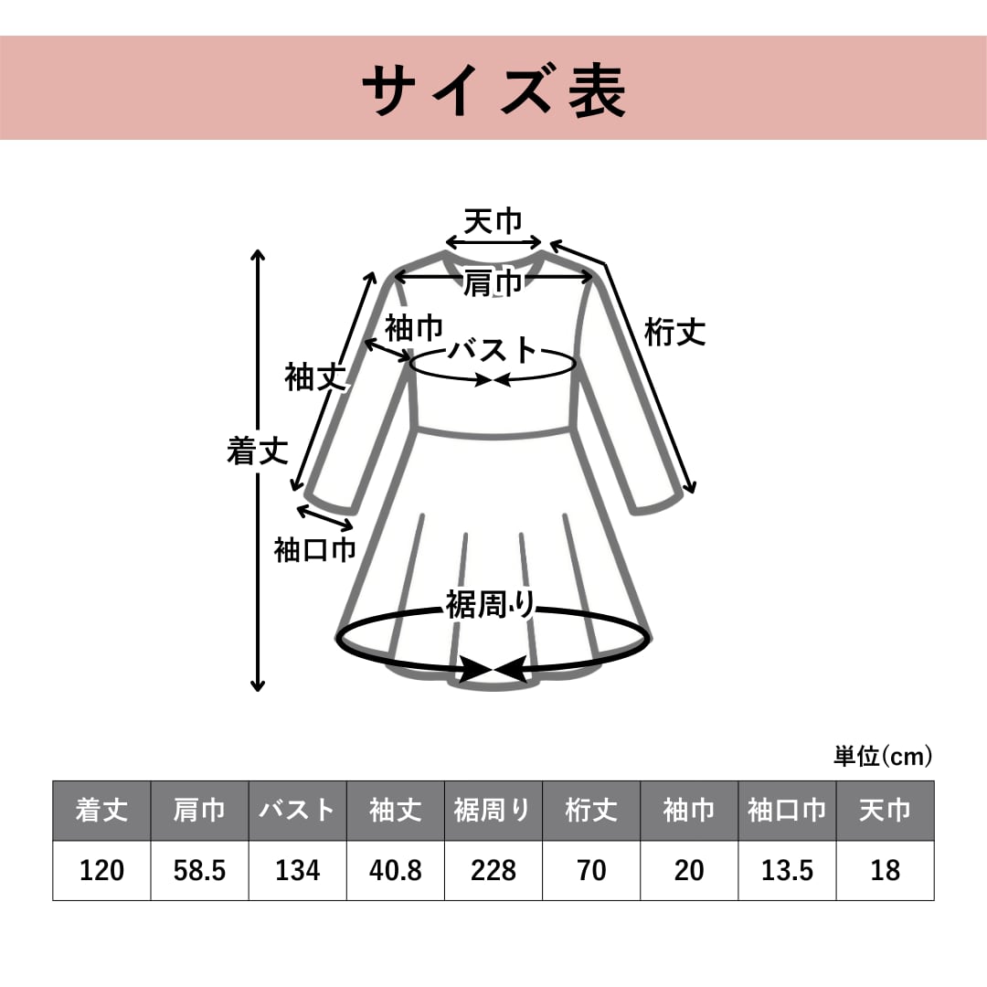 着丈:110.8cm | 肩巾:58.5cm | バスト:134cm | 袖丈:40.8cm | 裾周り:228cm