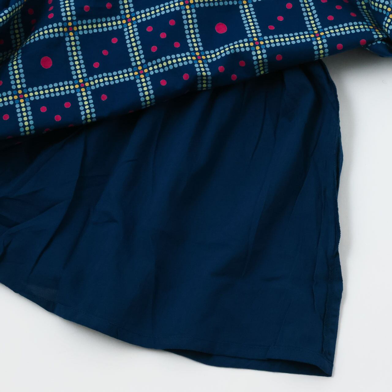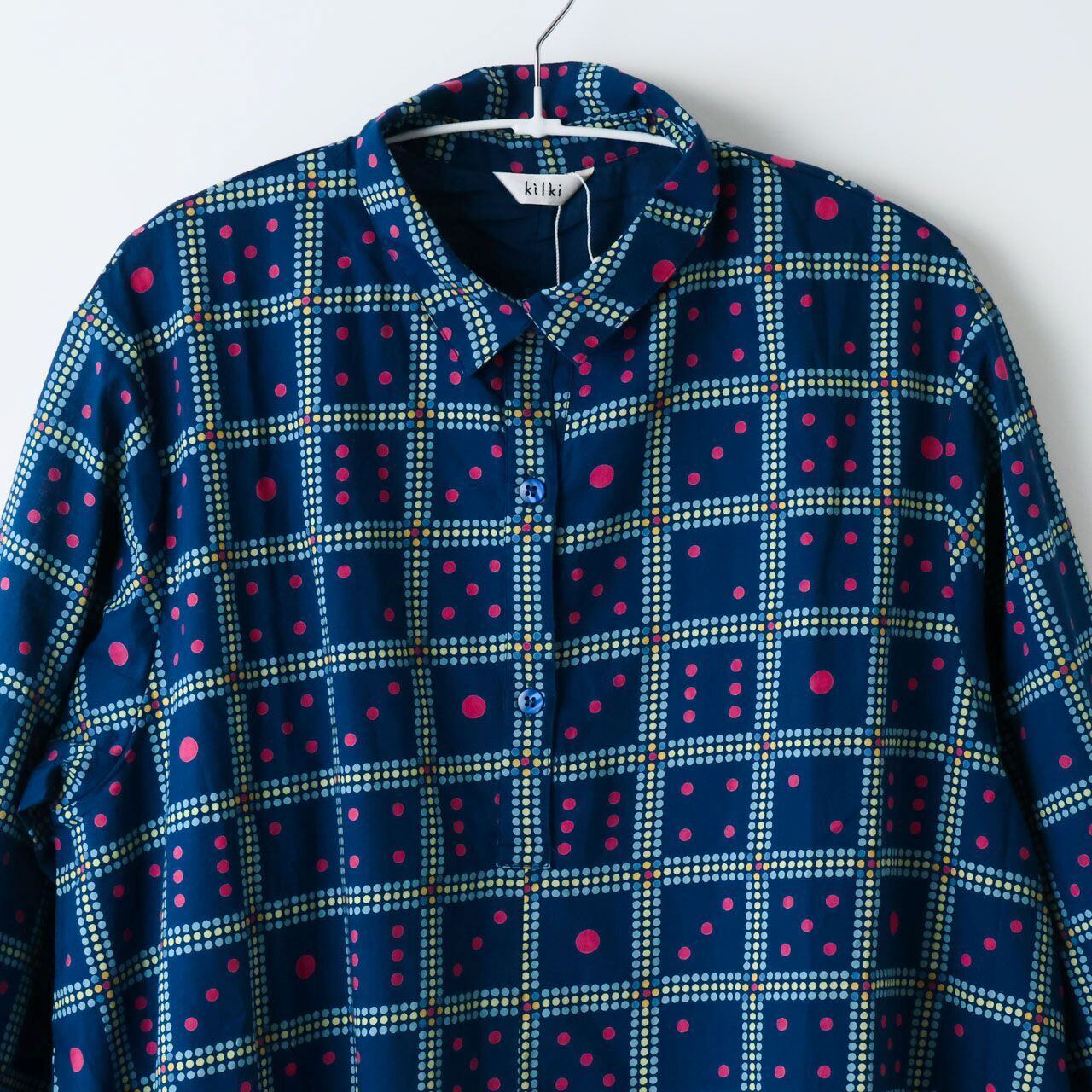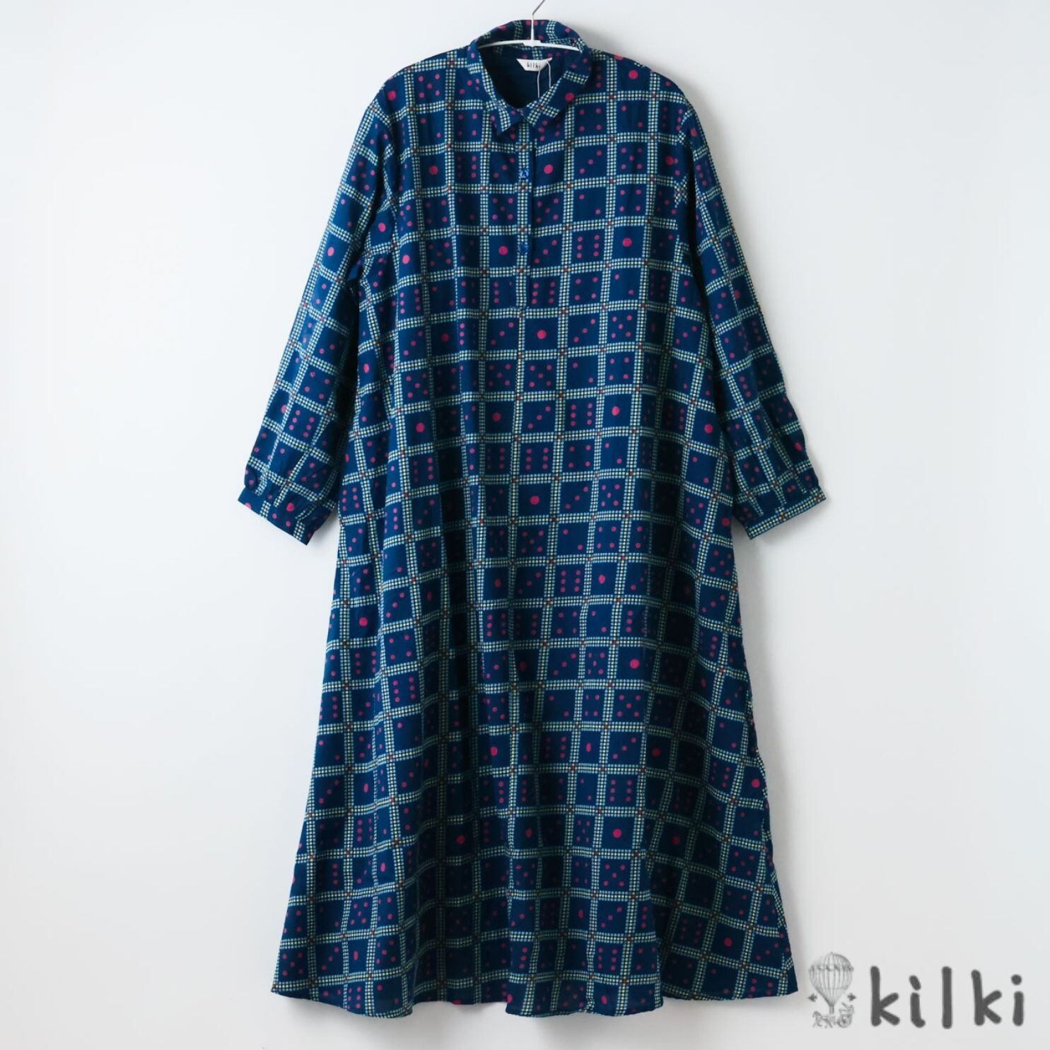 KILKI キルキー ワンピース ポケット付き レディース ダイスチェック 長袖 体型カバー ナチュラル 綿 コットン 100% キャンブリック 素材 インド製 チェック柄 かわいい 大人 ギフト プレゼント ネイビー 5B-D41 Kl005