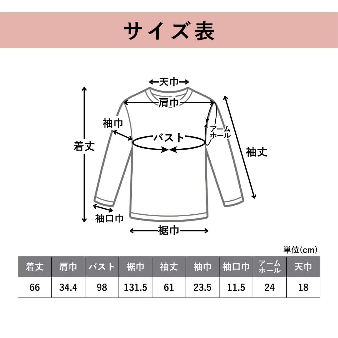 着丈:66cm | 肩巾:34.4cm | バスト:98cm | 裾巾:131.5cm | 袖丈:61cm