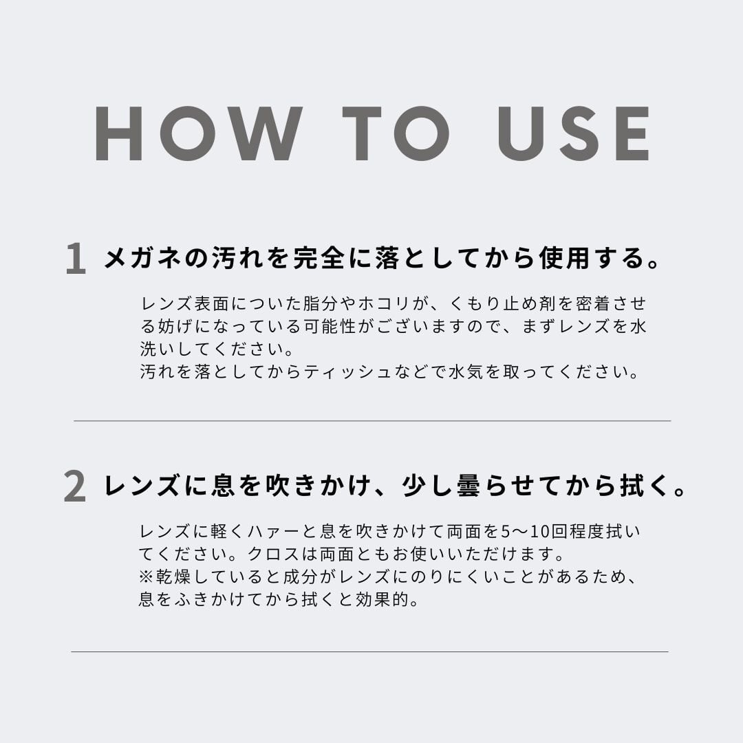 その後、レンズの表裏に息をハァーと吹きかけてから、本品で5〜10回程よく拭いて下さい。