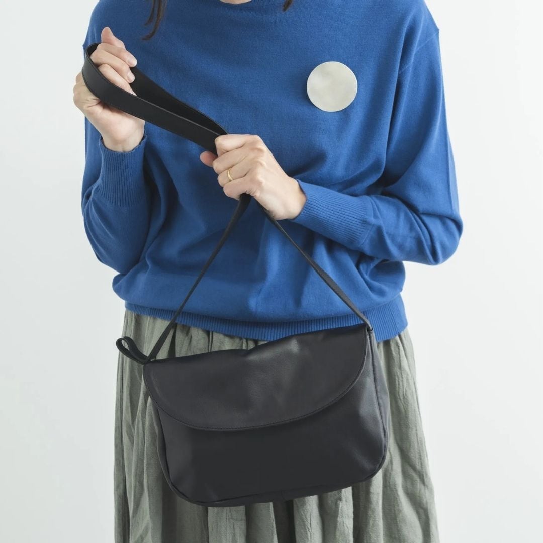 布作家・松澤紀美子さんの布鞄をモデルに、松澤さんと一緒に素材選びや構造の検証・調整を行って実現した、CLASKAオリジナルの革ポシェットです。