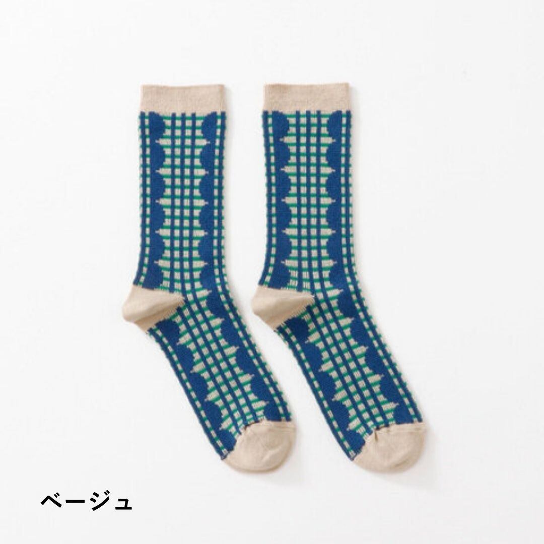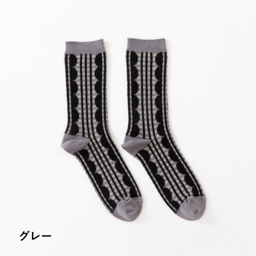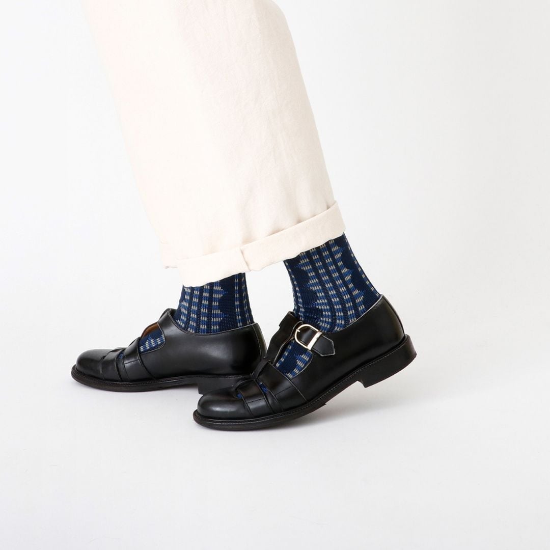 フリルとチェックを組み合わせた、繊細なシャドー編みが美しい一足です。