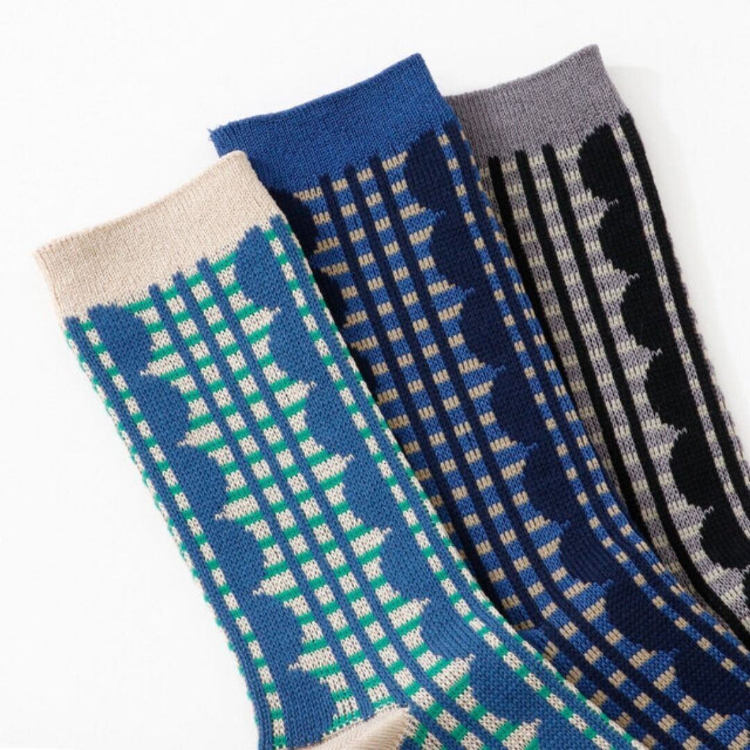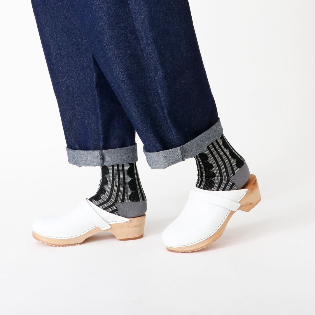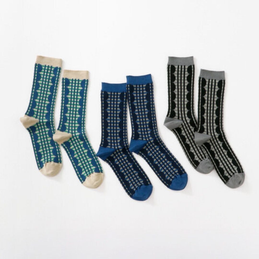 フリルとチェックを組み合わせた、繊細なシャドー編みが美しい一足です。