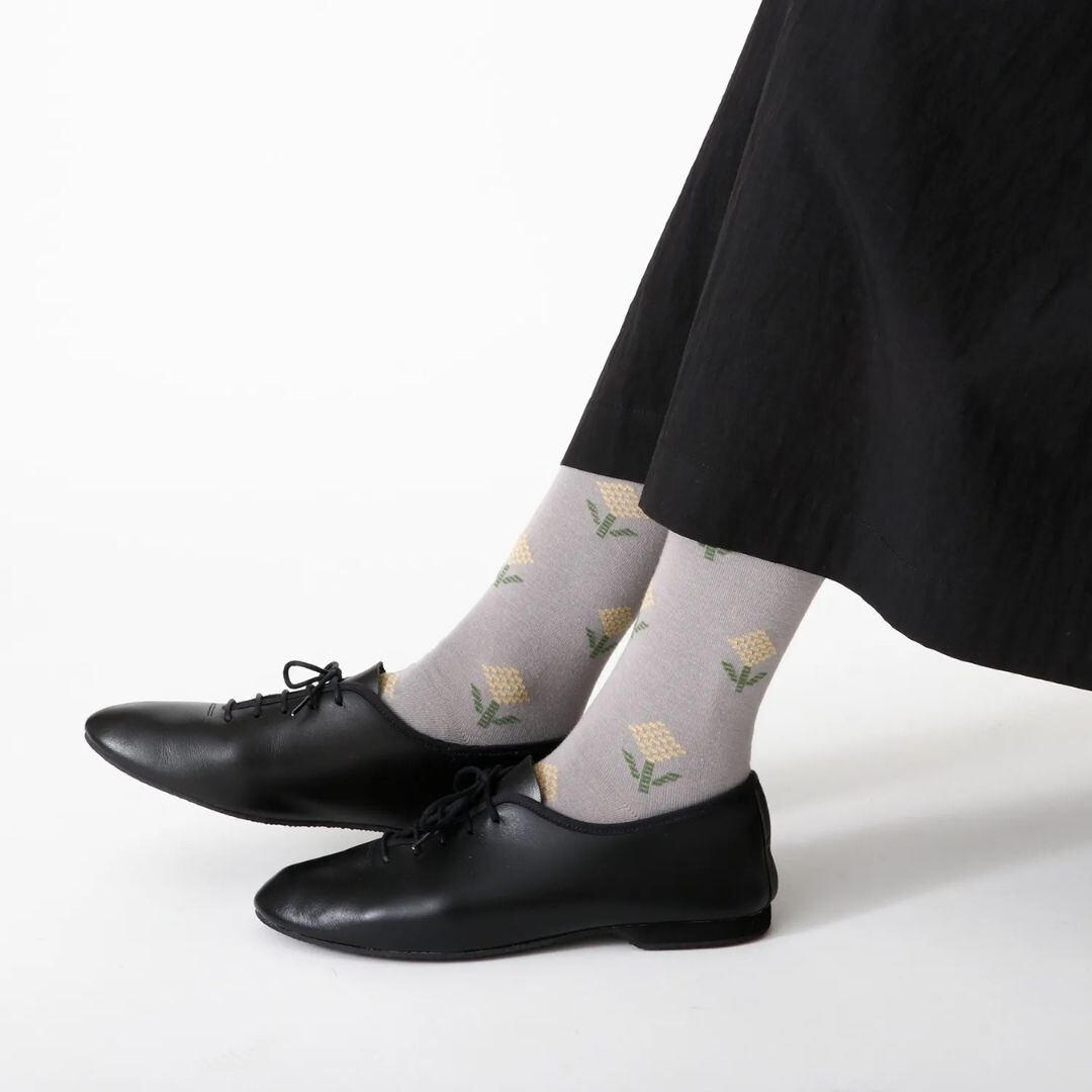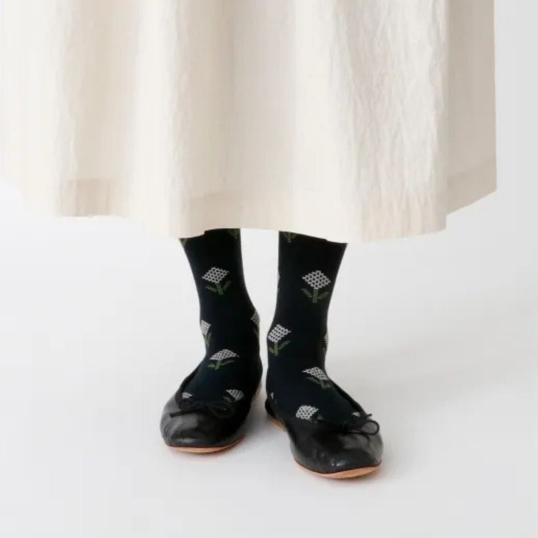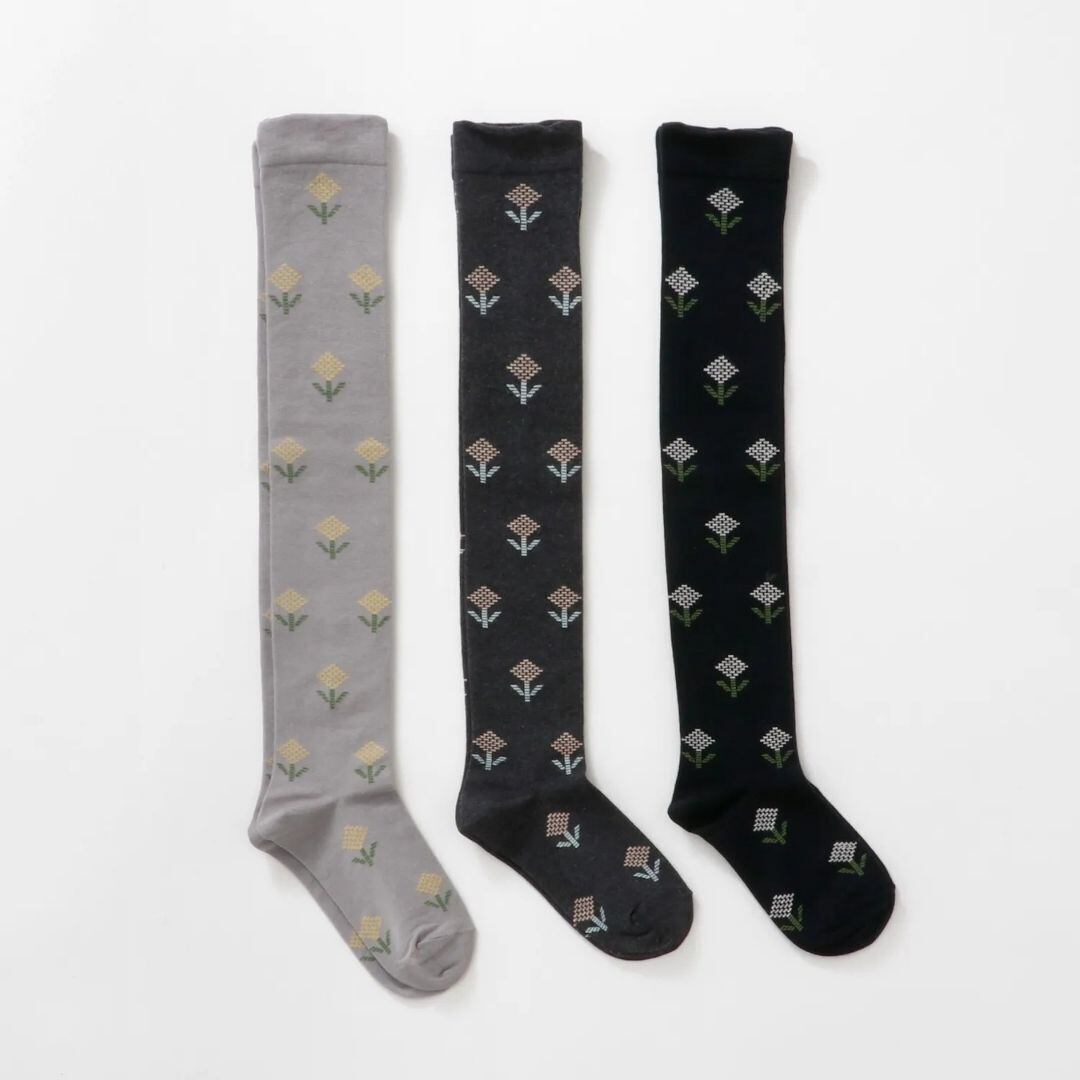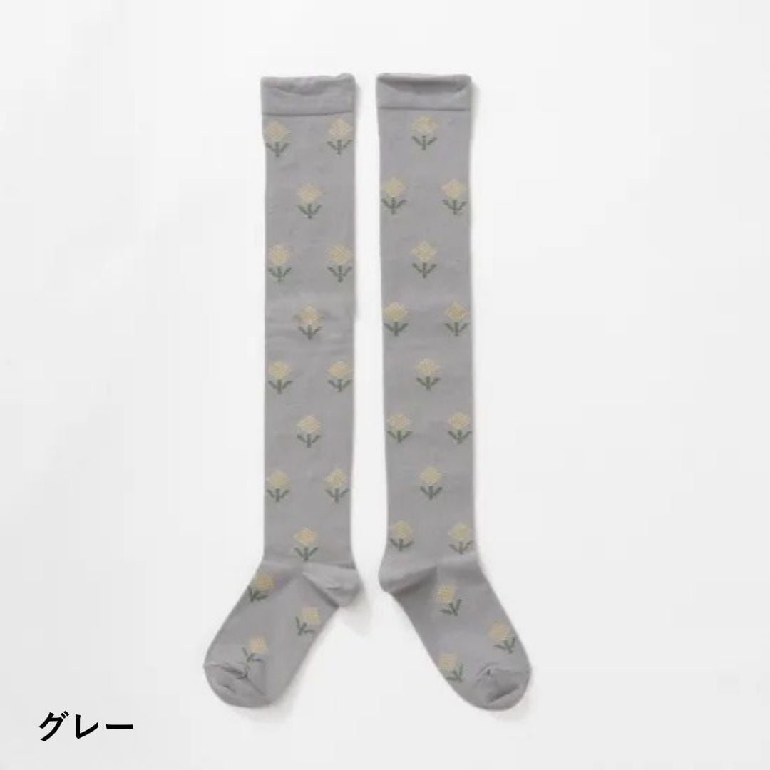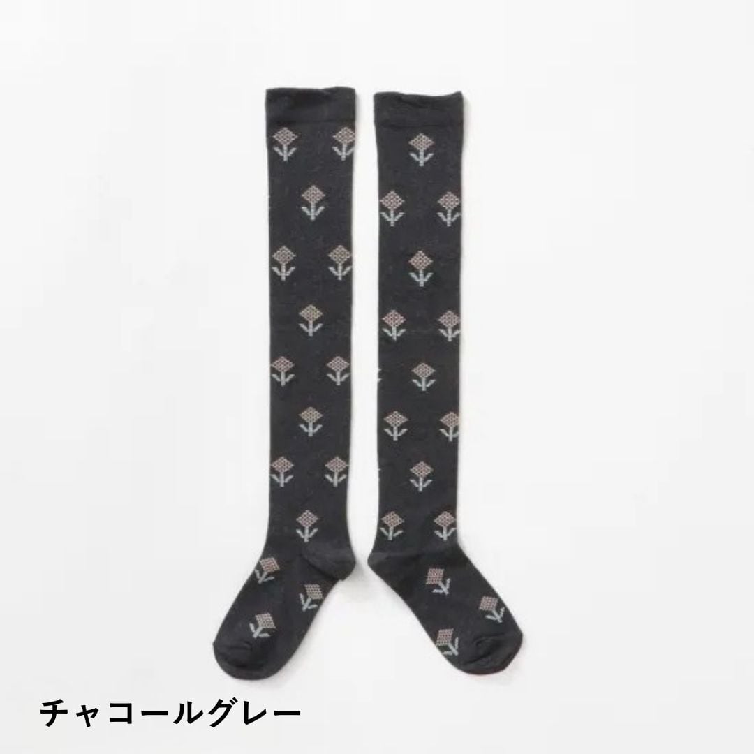 点描で描かれた小さなお花を散りばめた、甘さ控えめのハイソックス。