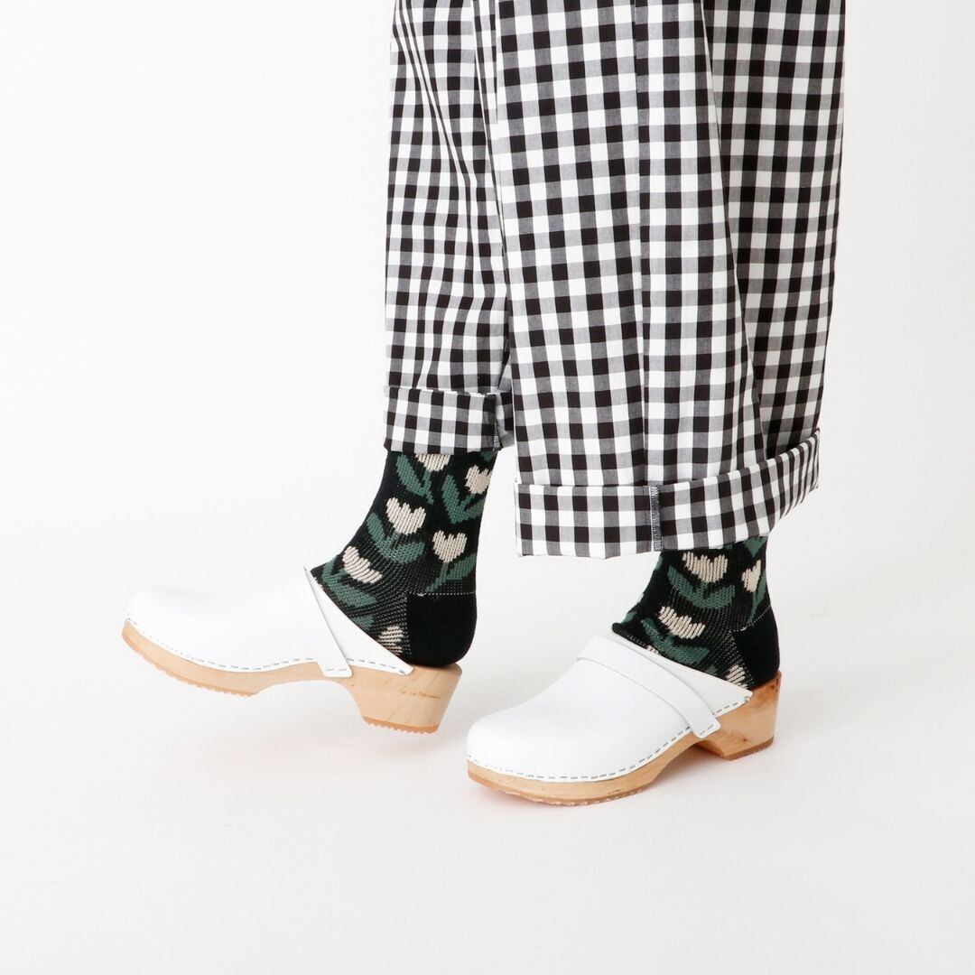 ベーシックなカラーに、ポップなチューリップ柄が映える大人かわいい一足。