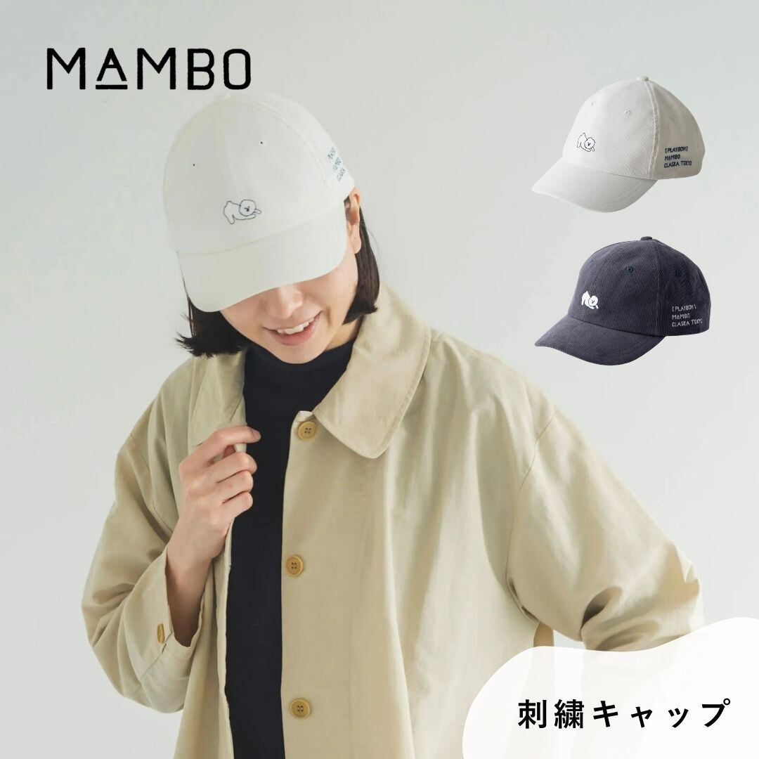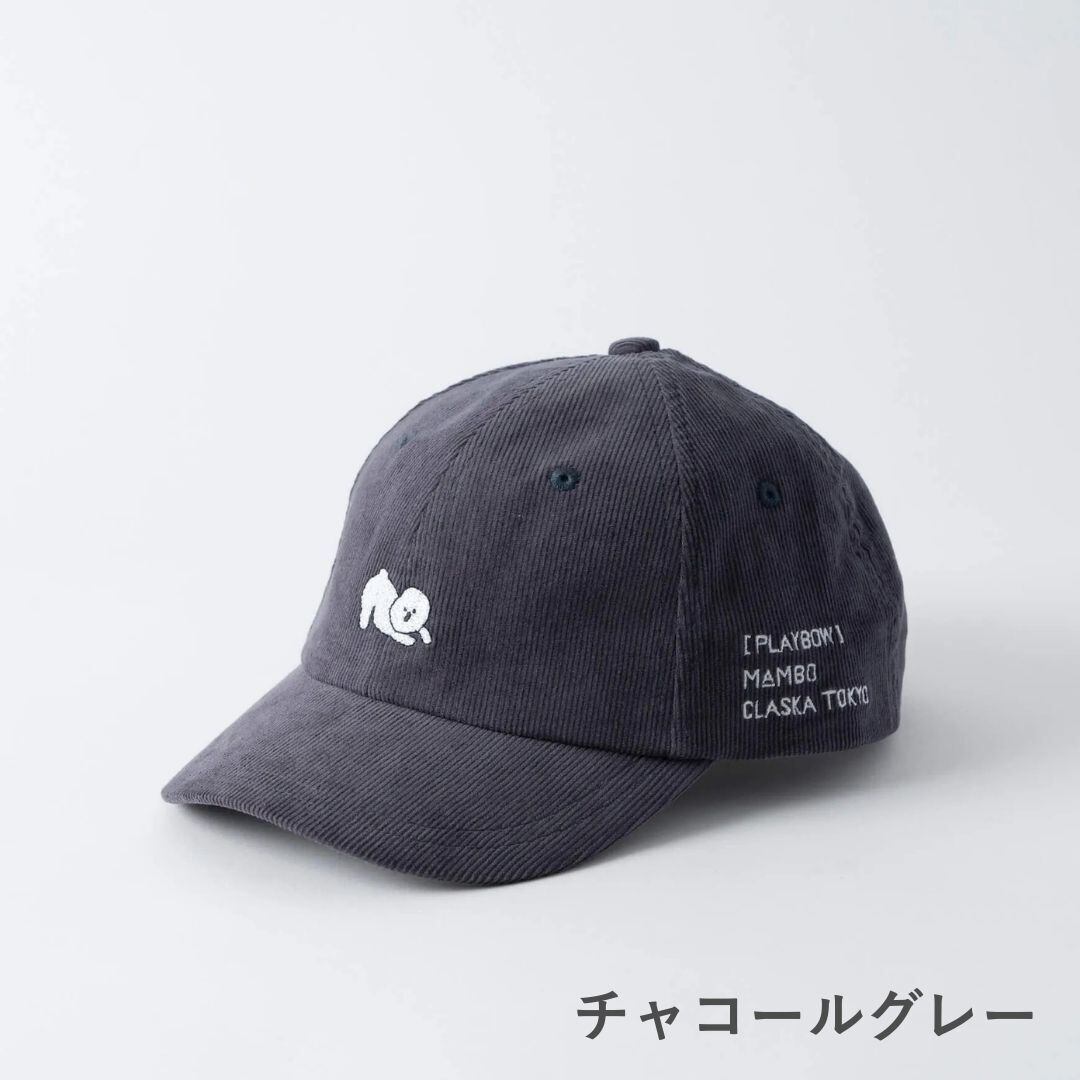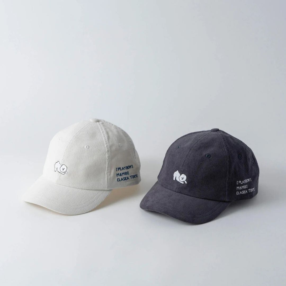 MAMBOシリーズから、「遊ぼうよ!」とお尻を高く上げた愛くるしいポーズが刺繍された、大人に似合うベースボールキャップです。