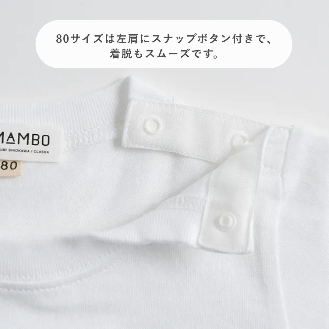 MAMBOシリーズから、「遊ぼうよ!」とお尻を高く上げたポーズがプリントされた、元気なキッズにぴったりのTシャツです。
