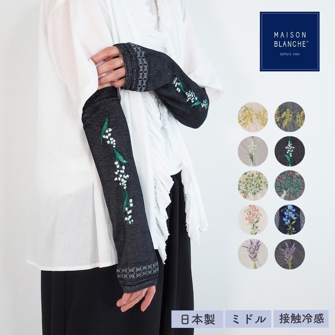 maison blanche メゾンブランシュ おさんぽアームカバー ミドル丈 接触冷感 アームカバー 刺繍 冷感 かわいい レディース 日本製 国産 ひんやり 腕カバー おしゃれ 紫外線対策 花柄 締め付けない 約35cm 57120029 Mb025