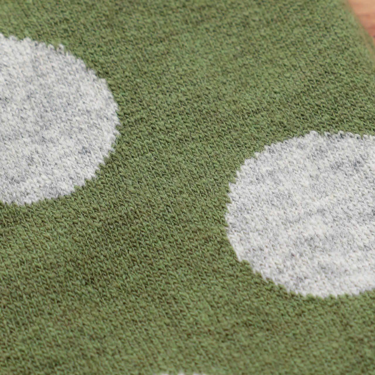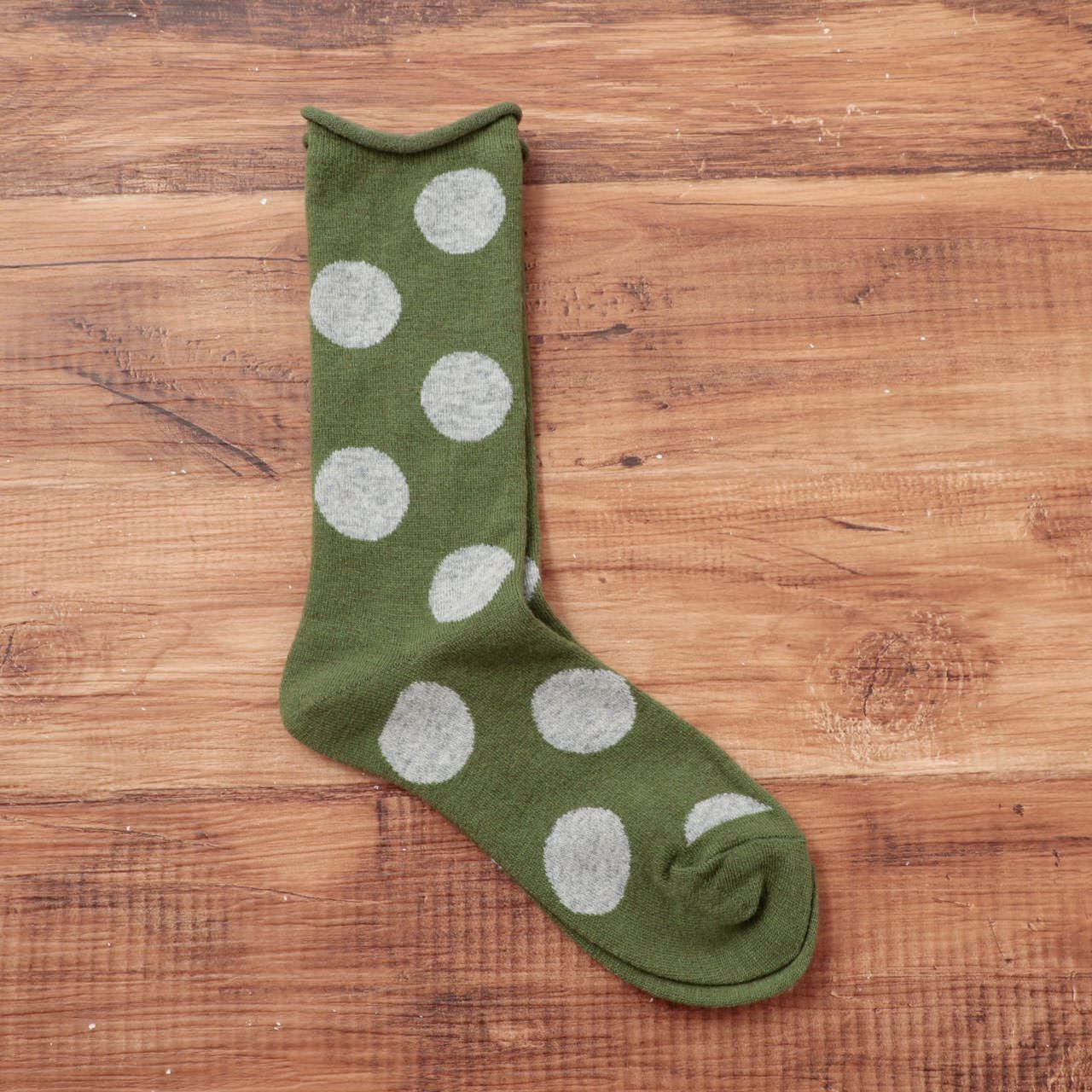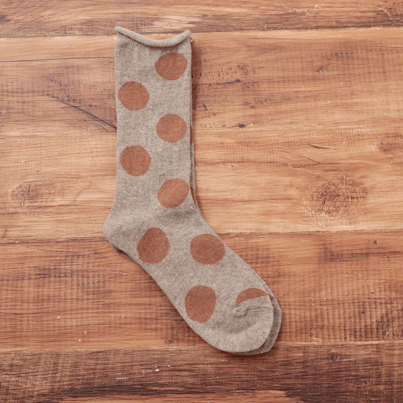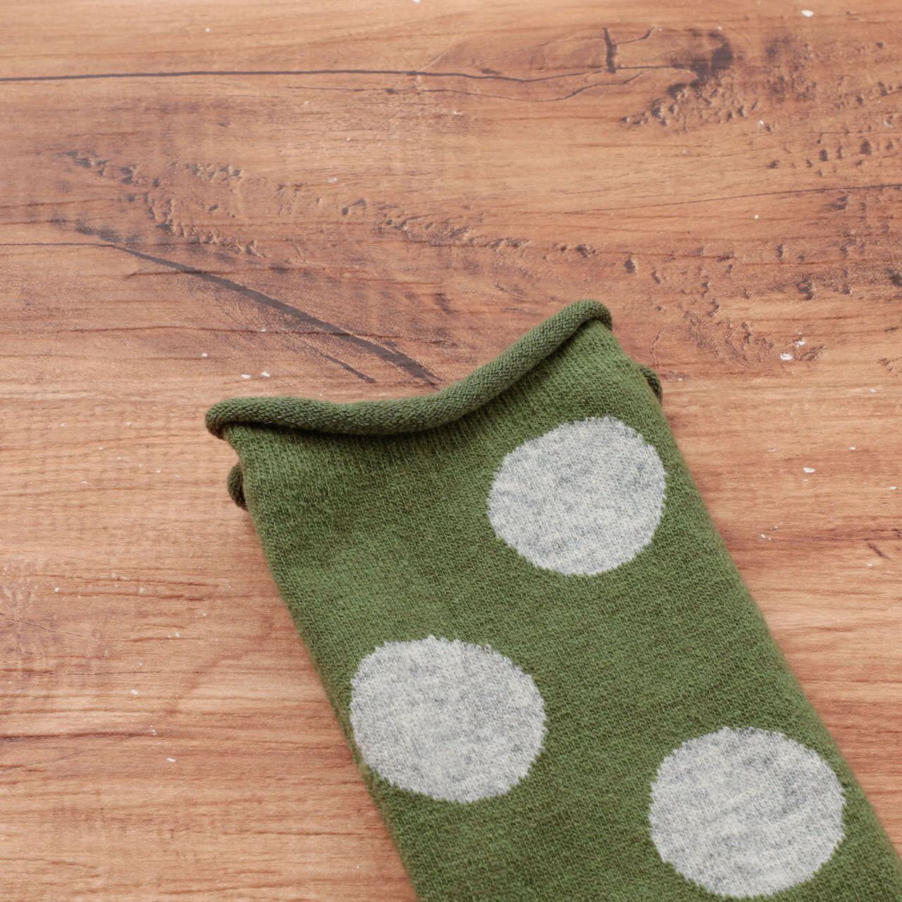 履き口がくるんと丸まったデザインで、大きめのドット柄が可愛い印象のウール混ドットソックスです。