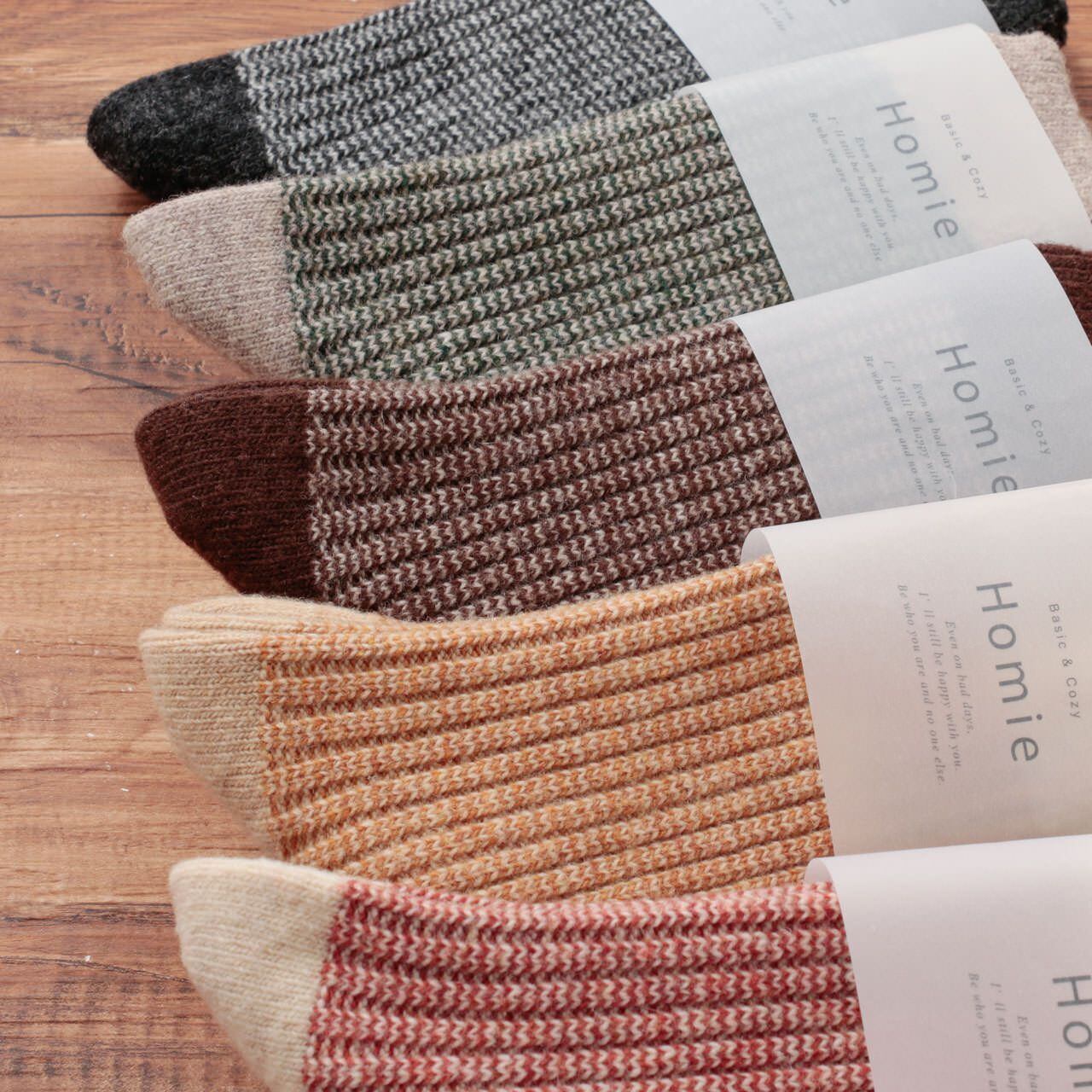 ホミー Homie 靴下 ソックス レディース ウール ジャガードソックス ウール79% バイカラー おしゃれ かわいい 暖かい 日本製 ギフト プレゼント 23-25 H-042 ベージュ/ブラウン/チャコール/グリーン/マスタード Hm018