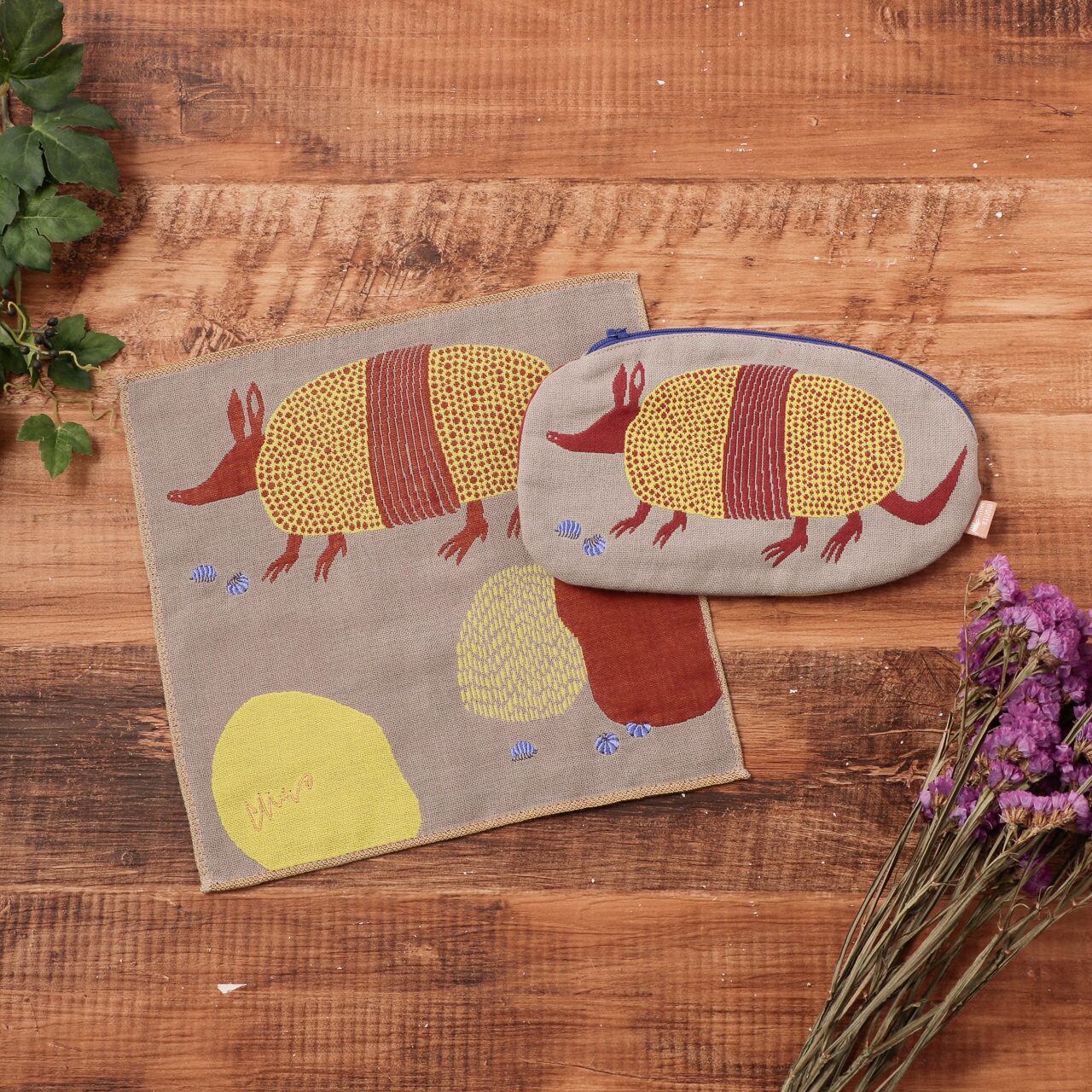 ゆっくりとした世界に暮らす生き物たちのカワイイ形のポーチとワンポイント刺繍が入ったふわりと軽い三重ガーゼのセットです。