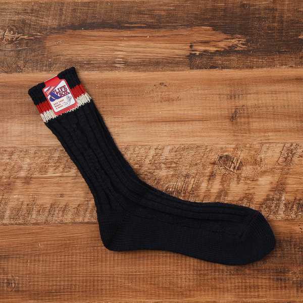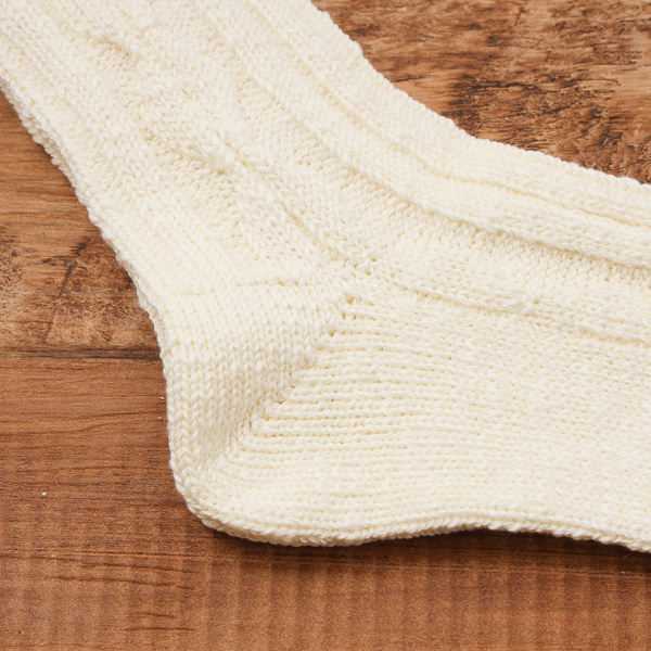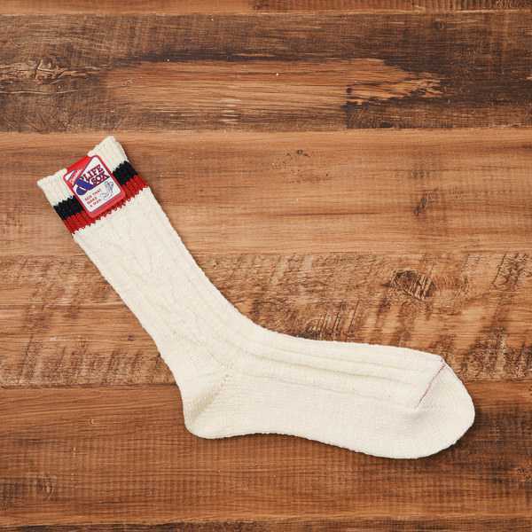 首回りにラインが入ったケーブル編みのクリケットセーターをモチーフに作られたソックスです。