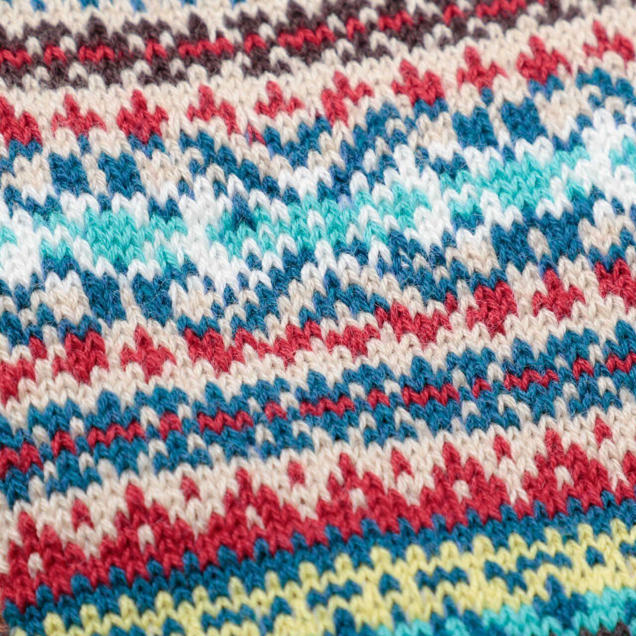 スコットランド北のフェア島を発祥地とする、段ごとに異なった幾何学的な柄やカラフルな色合いを特徴としたフェアアイルセーターの柄をソックスで表現。