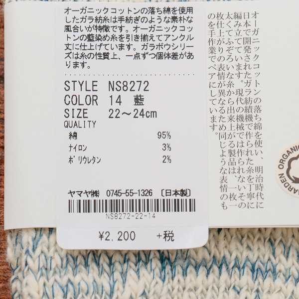 オーガニックガーデン 靴下 ソックス レディース オーガニックコットン 綿 ガラボウ アンクル 藍染め 厚手 ブランド 日本製 国産 プレゼント ギフト 22.5-24.5 藍色 ブルー 0001-22 Or097