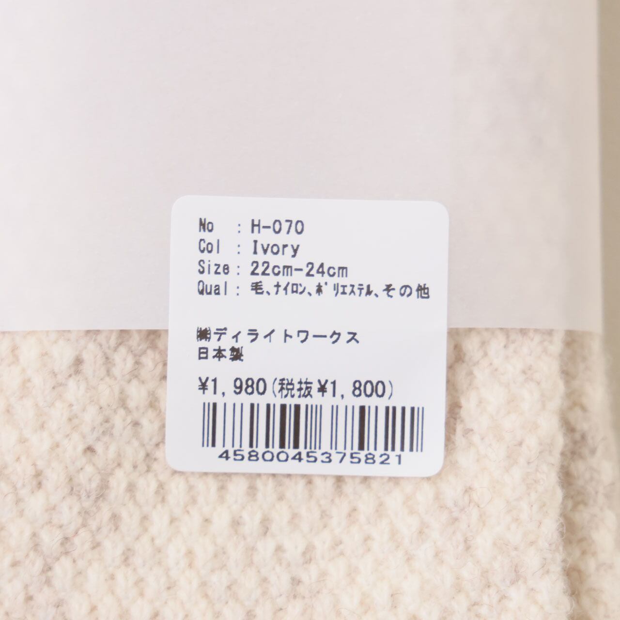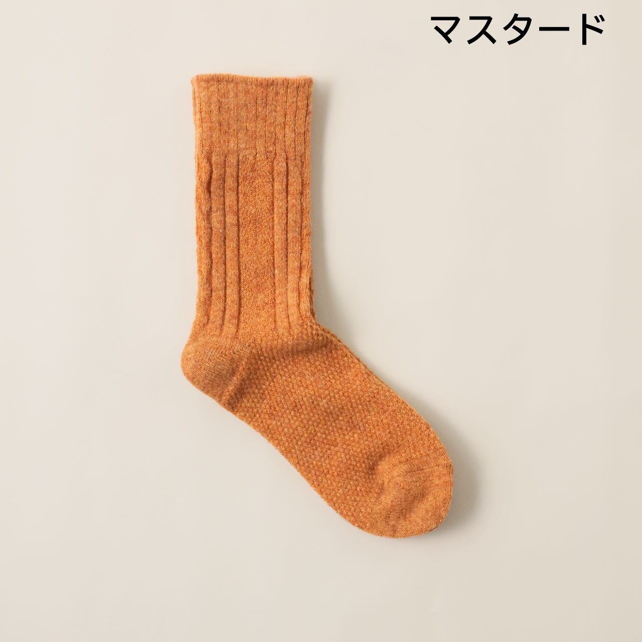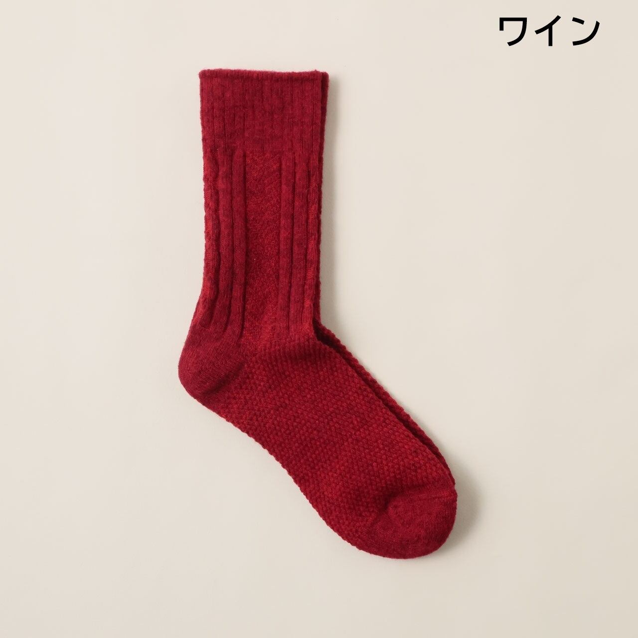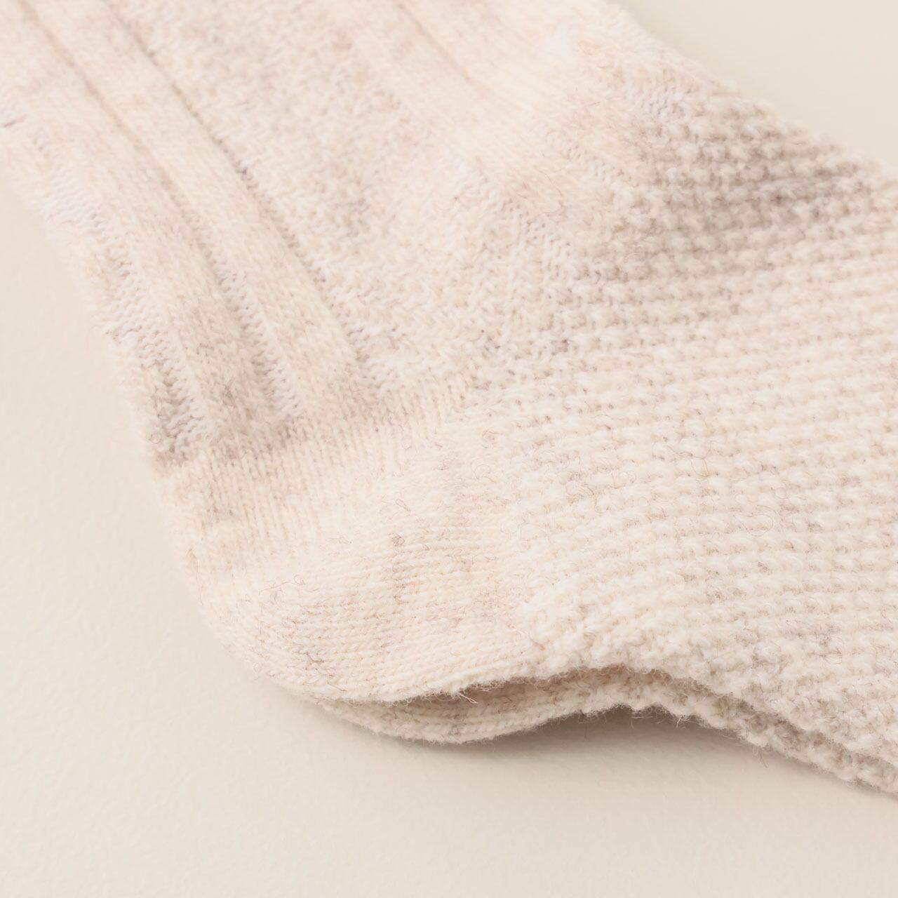 ふわふわと程良く厚みのあるウール糸を使用。 ウール混率も高く、足元をしっかりと保温してくれる一足です。